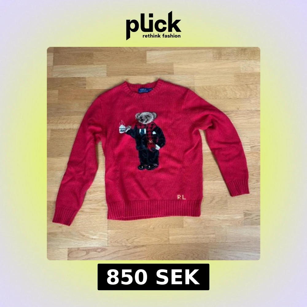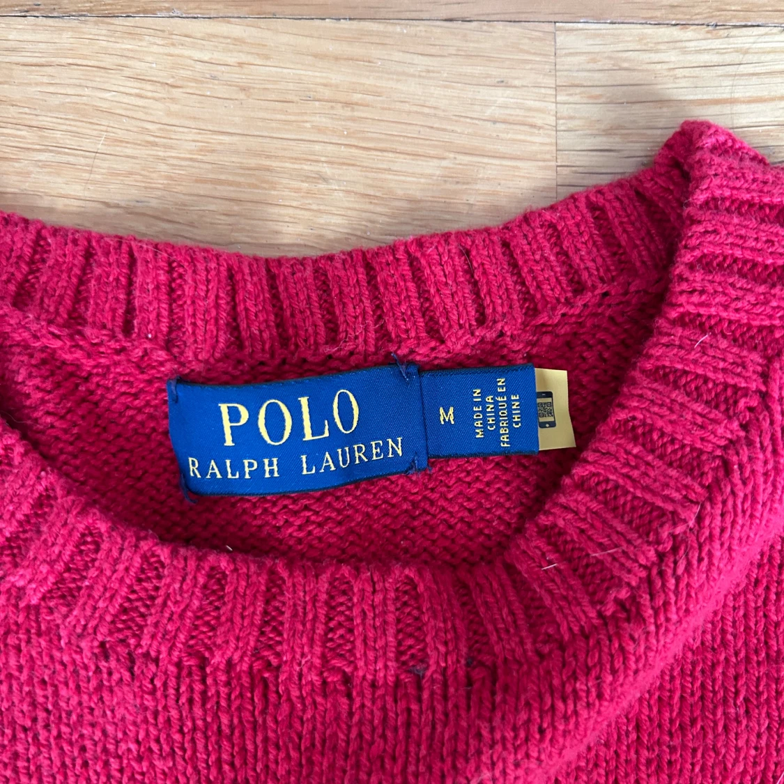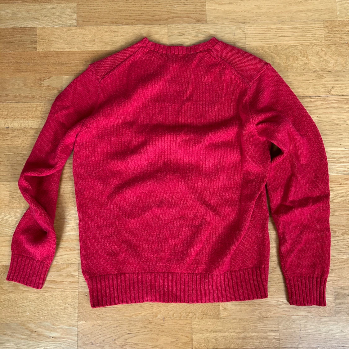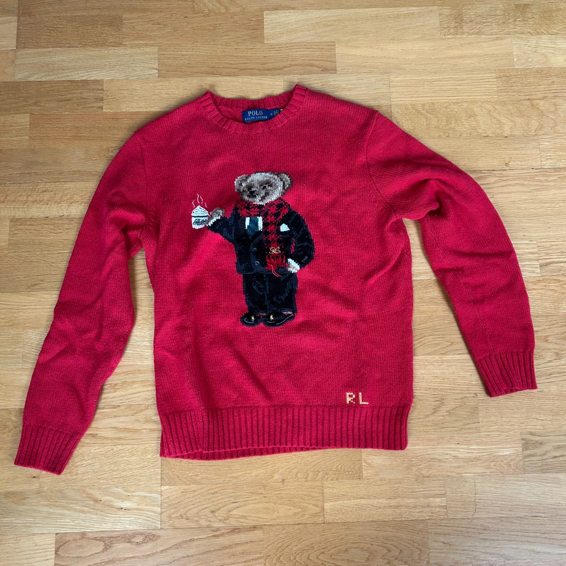 Säljer en röd stickad tröja från Polo Ralph Lauren med deras ikoniska björn broderad på framsidan. Tröjan har rund halsringning och långa ärmar. Perfekt för dig som vill ha något unikt och stilrent. Storlek M men passar även S.