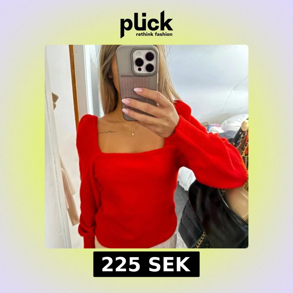 Snygg röd stickad tröja med fyrkantig urringning och puffiga axlar. Tröjan har långa ärmar och ribbade muddar vid ärmslut och nederkant. Perfekt för dig som vill ha en färgstark och trendig look.