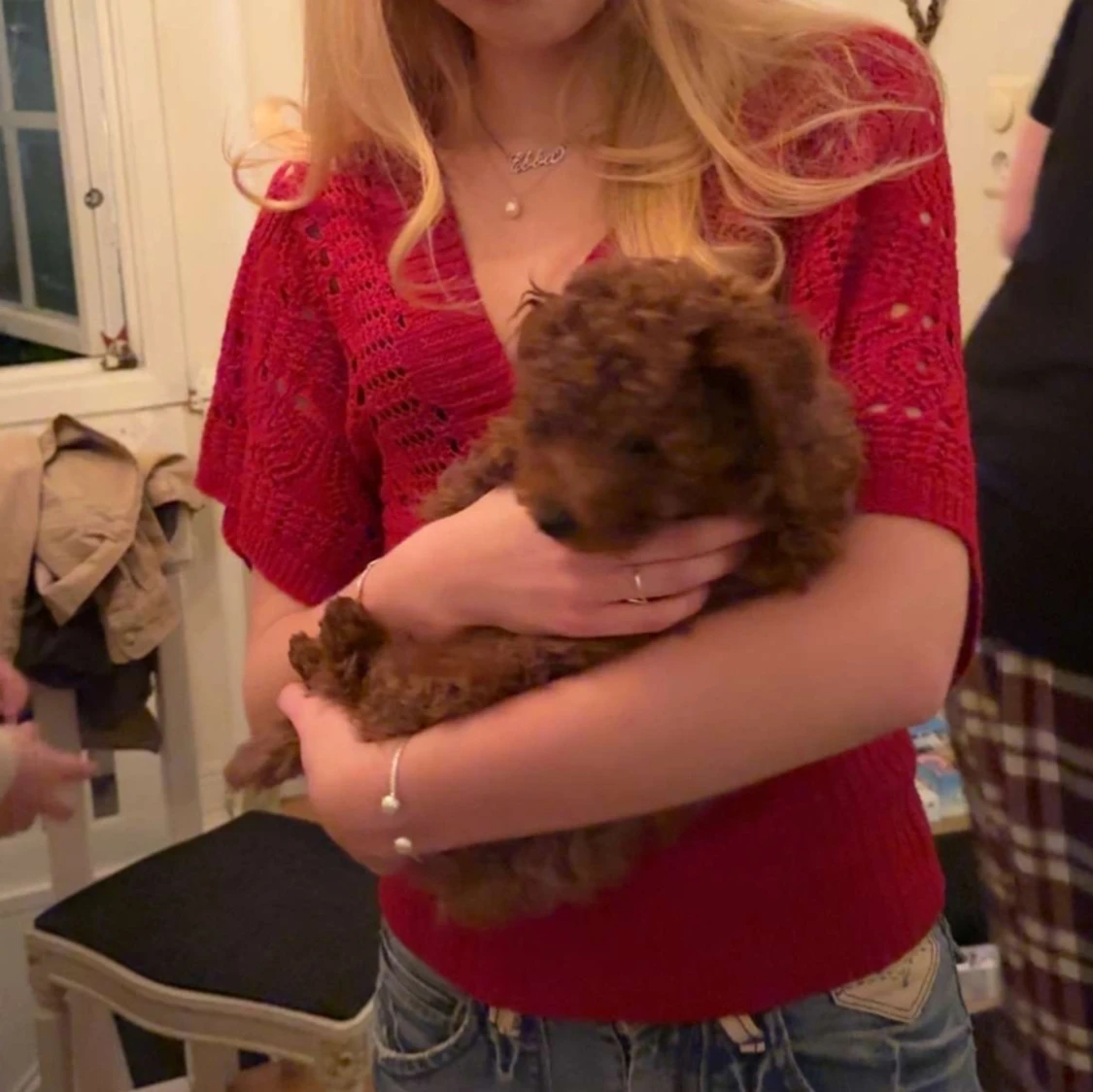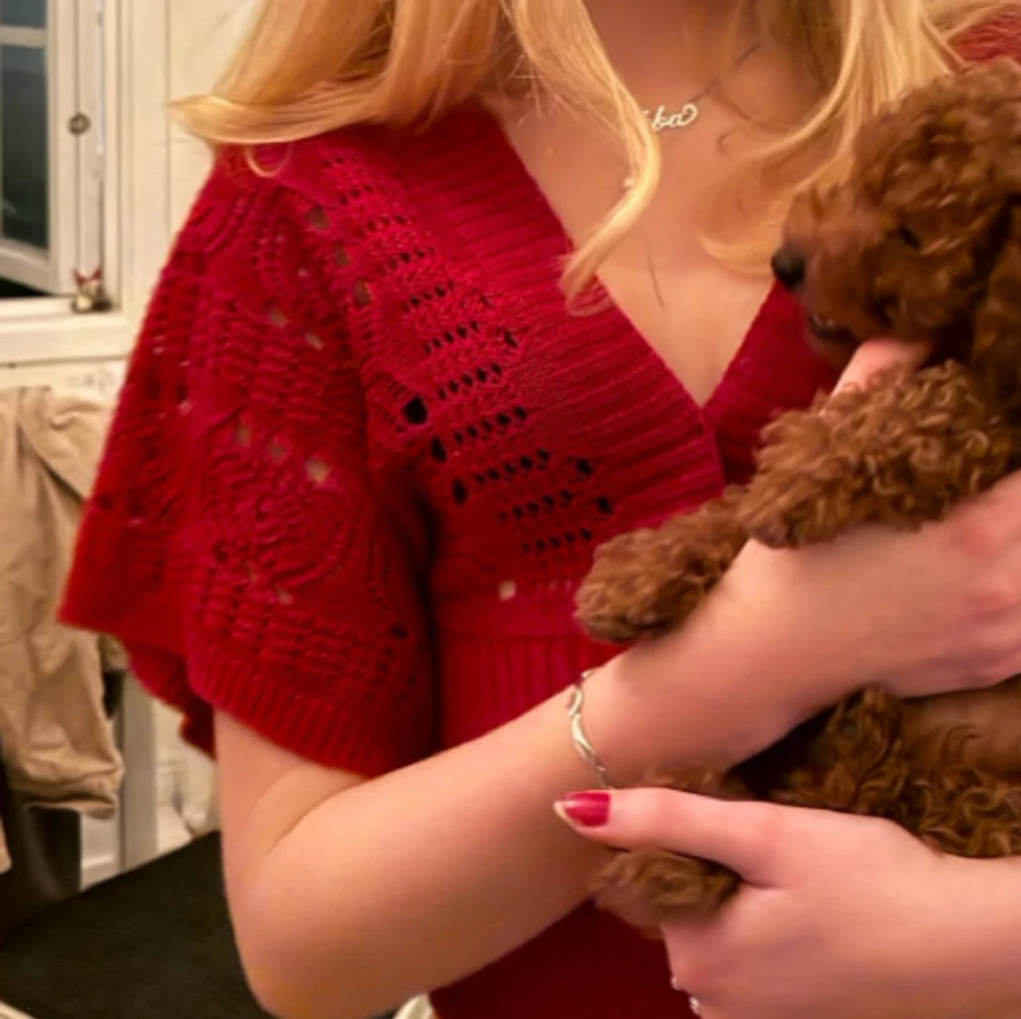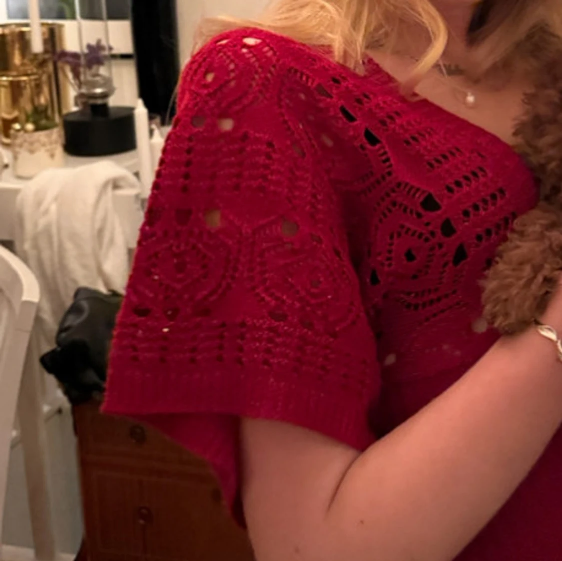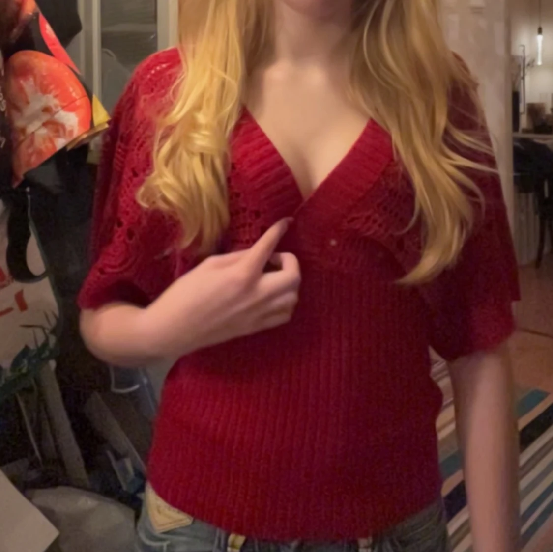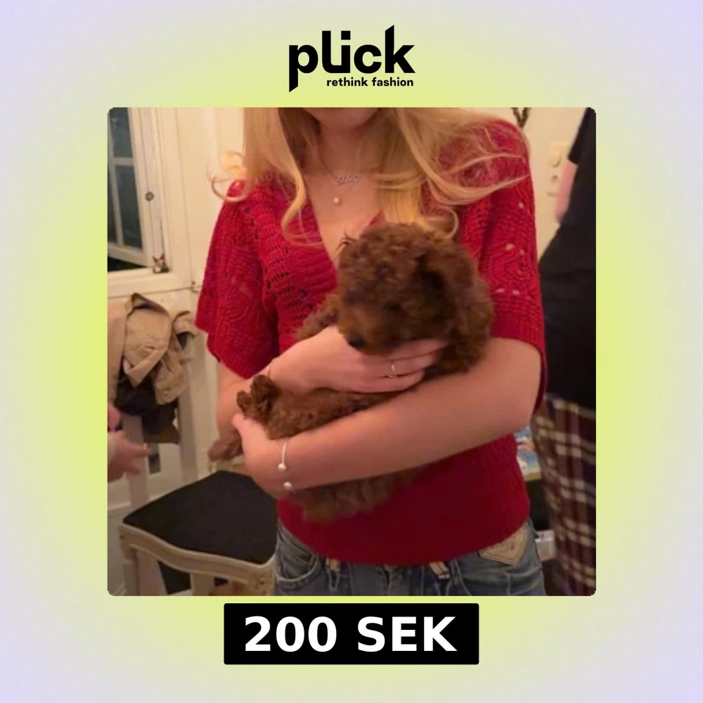 Snygg röd stickad tröja med v-ringning och fina breda ärmar. Tröjan har ett unikt hålmönster och en tajt ribbad midja som ger en schysst passform. Perfekt att styla med jeans för en cool look. Perfekt för jul och kräftskiva😁