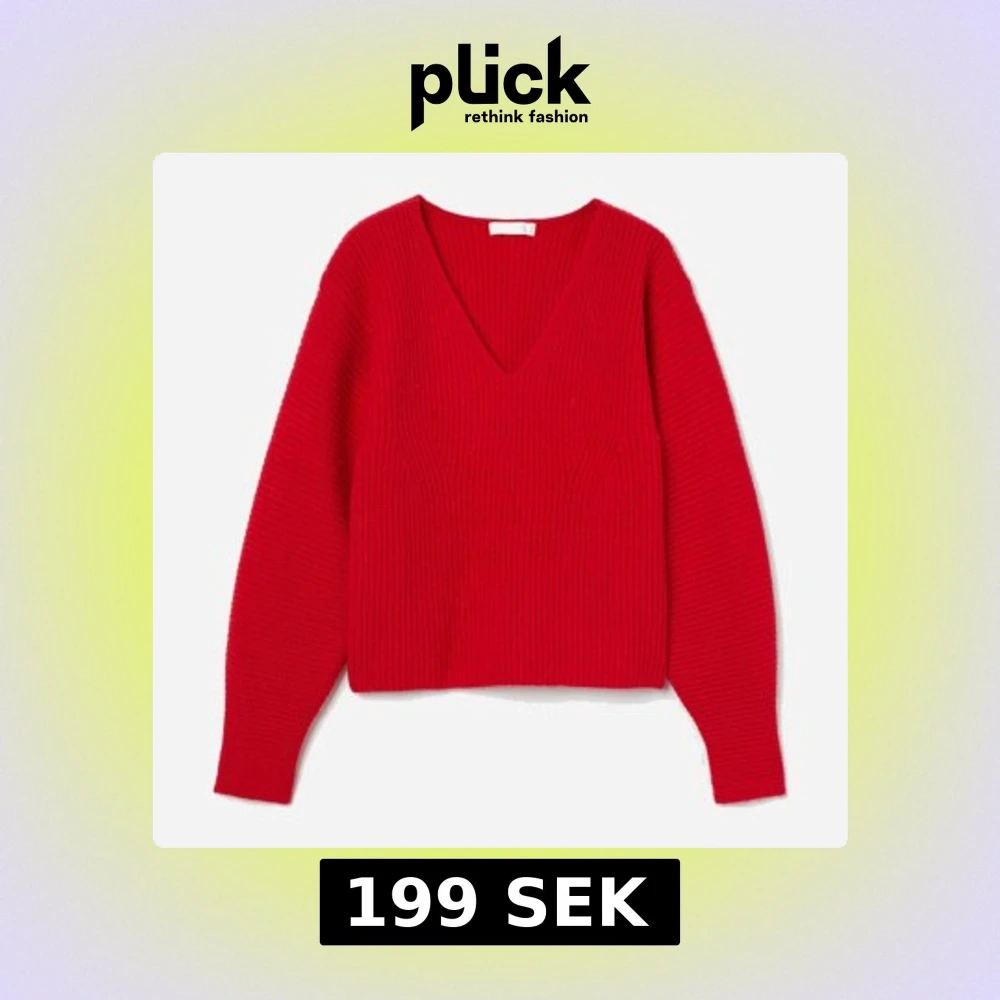 Riktigt snygg röd stickad tröja från H&M med v-ringning och långa ärmar. Perfekt för att liva upp din höst- eller vinterstil. Tröjan har en klassisk passform och ribbad struktur som ger en trendig vibe. Använd en gång.