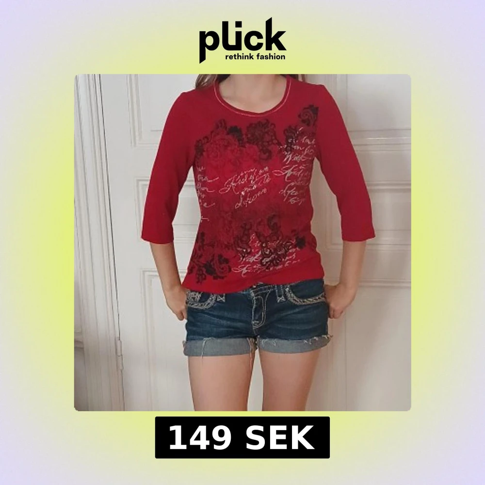 Röd topp med trekvartsärm, coolt svart och vitt tryck framtill och dekorativ spetsdetalj över bröstet. Materialet känns som bomull och toppen har en rund halsringning. Perfekt för dig som vill sticka ut lite extra med snygga detaljer. Köpt på en second hand men har nästan aldrig använt den så den är i bra skick, vad jag kan se har inte heller någon av rhinestonesen ramlat av❤️