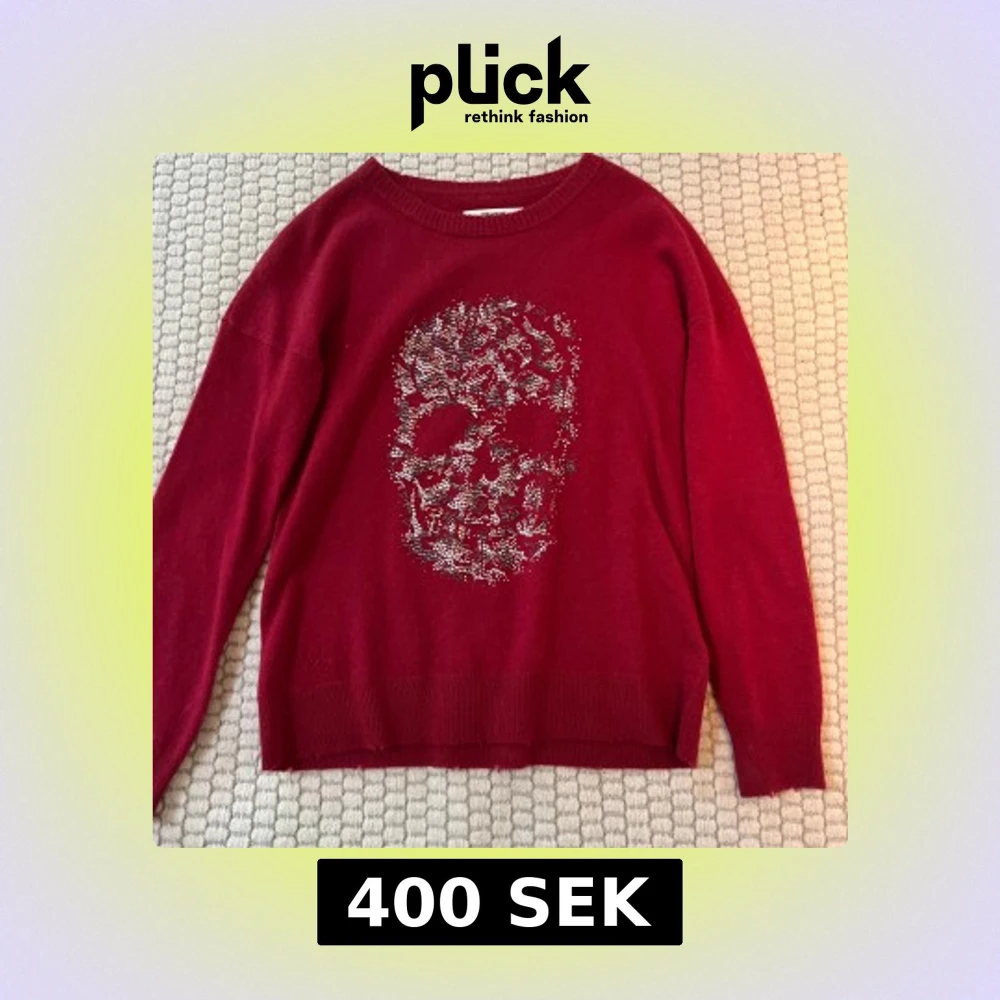 Snygg röd tröja med ett coolt dödskallemönster i silver på framsidan. Tröjan har långa ärmar och en rund halsringning. Perfekt för att ge din outfit en edgy touch.