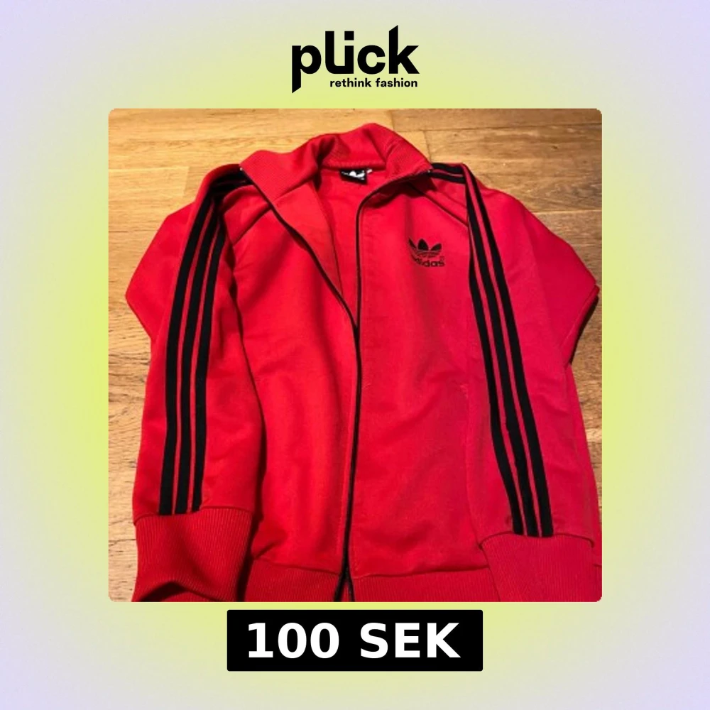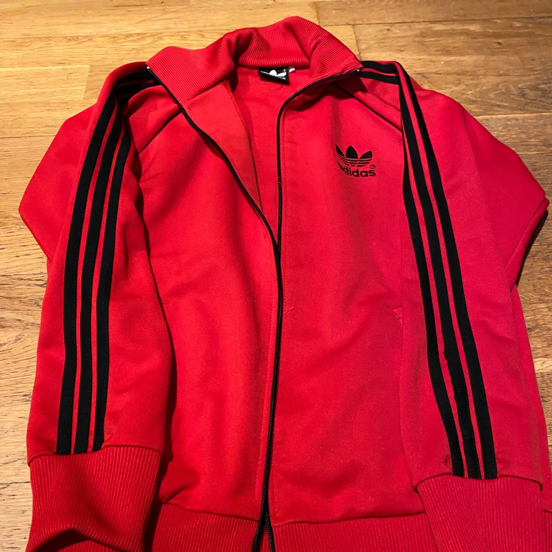 Snygg röd vintage original träningsjacka från Adidas med svarta ränder längs ärmarna. Jackan har dragkedja som och ribbade muddar vid ärmslut. Perfekt för en sportig look! Dragkedja är trasig men kan fixas av den händige!