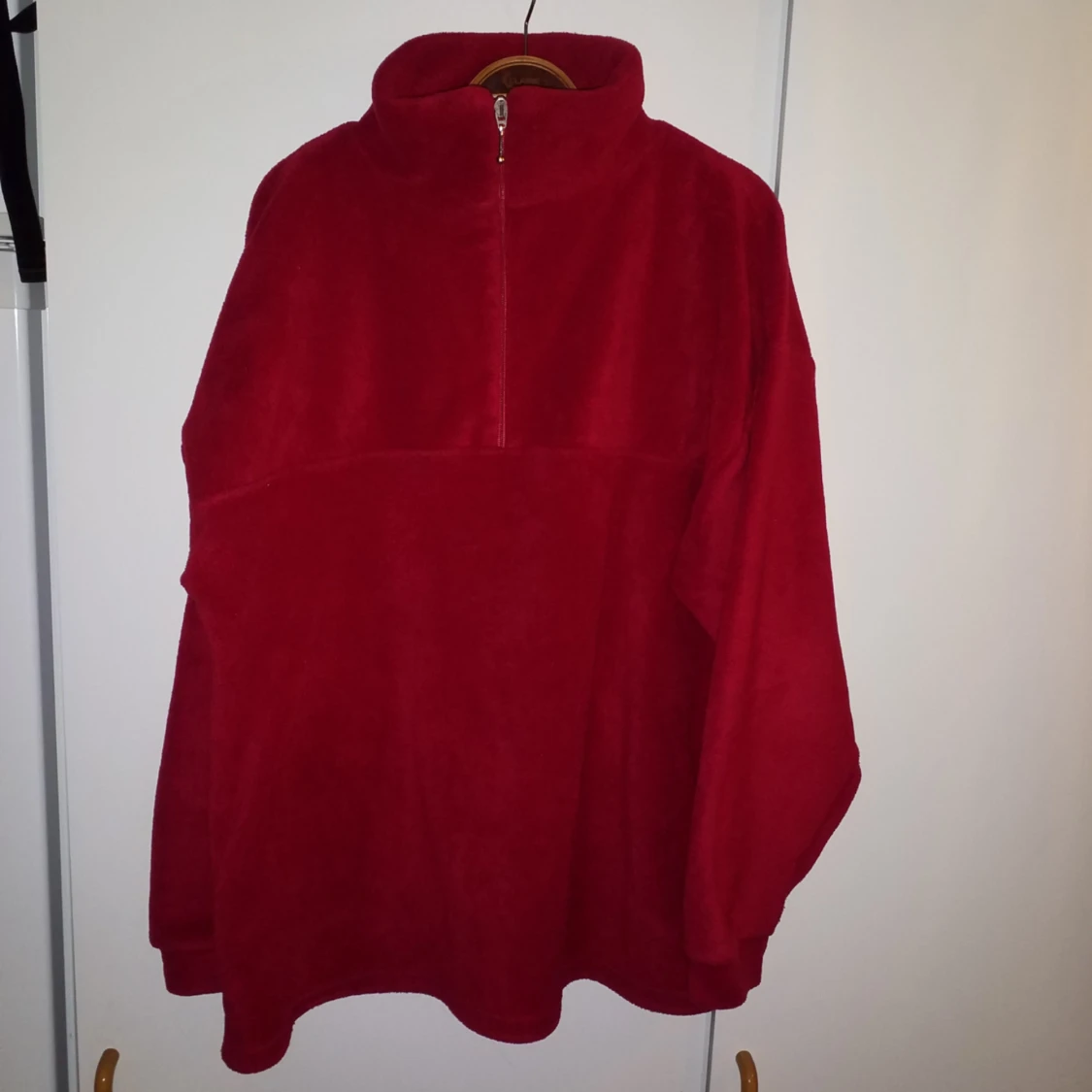 Superfin röd fleecetröja man kan ha som tröja eller jacka. Står ingen storlek i den men passar upp till xl