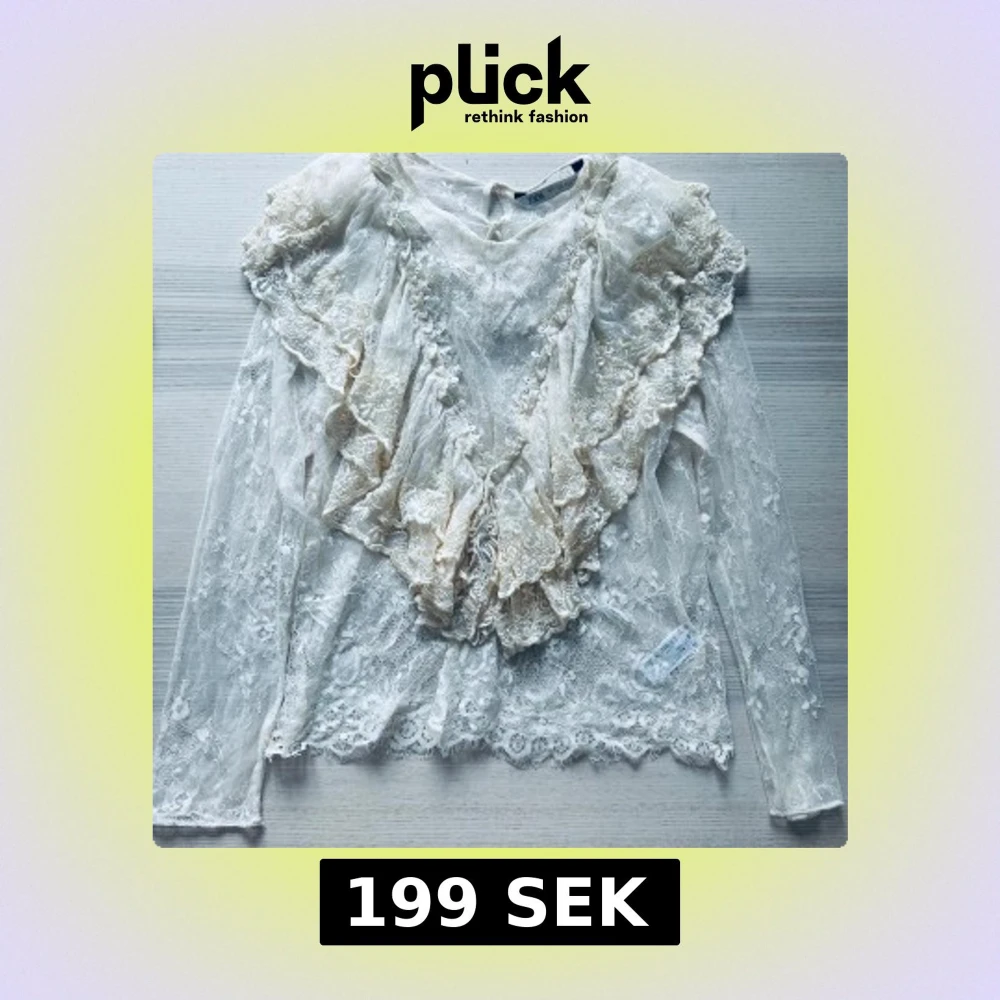 Romantisk vit spetsblus från Zara med långa ärmar och vackra volangdetaljer framtill och vid axlarna. Blusen är genombruten och har ett feminint uttryck med mycket spets och fina detaljer.