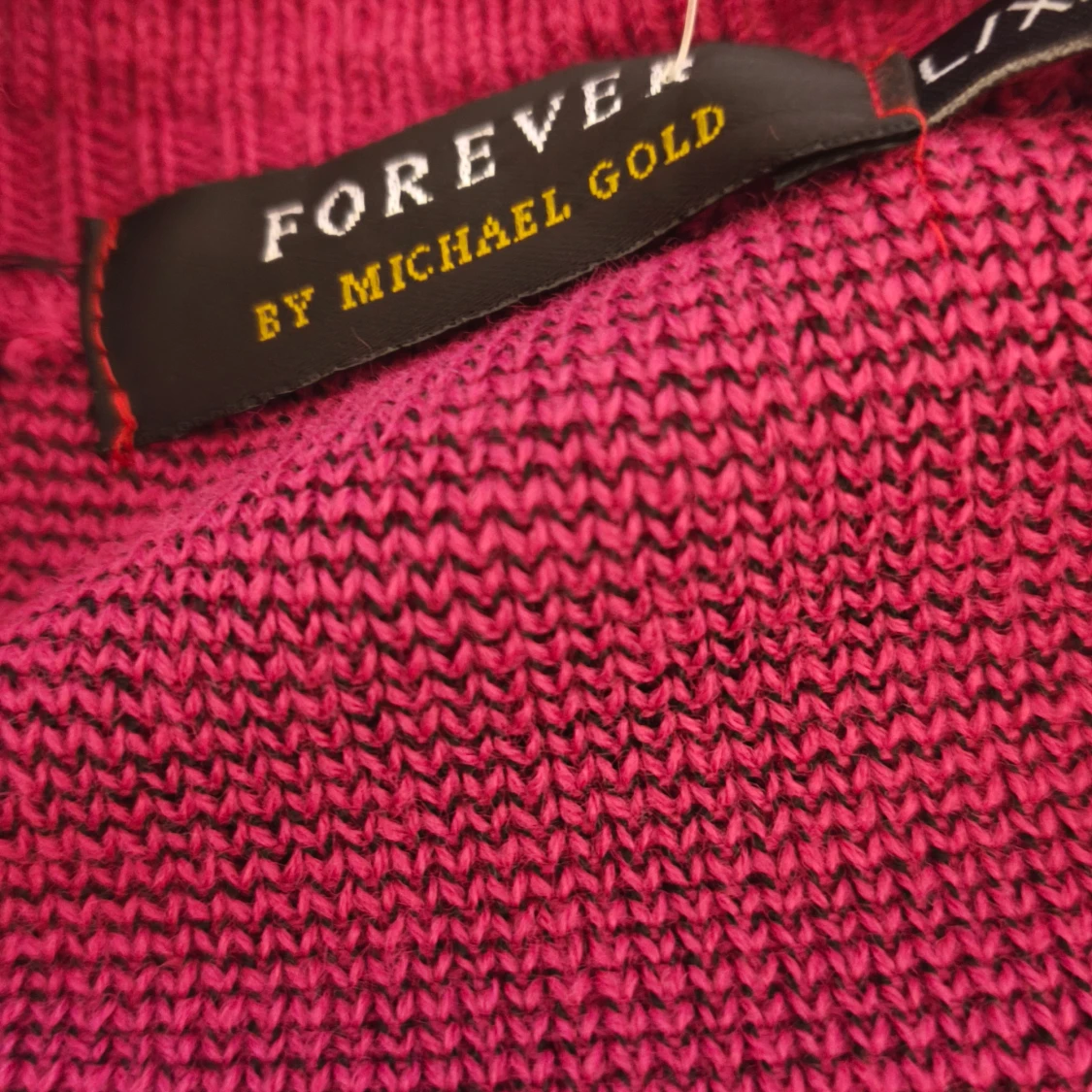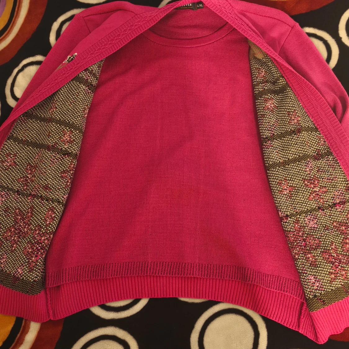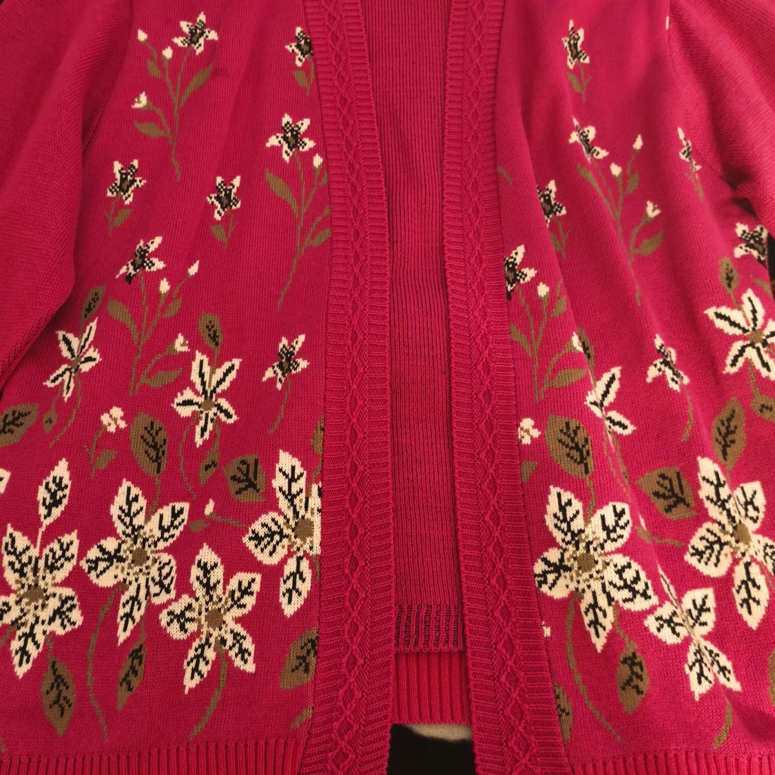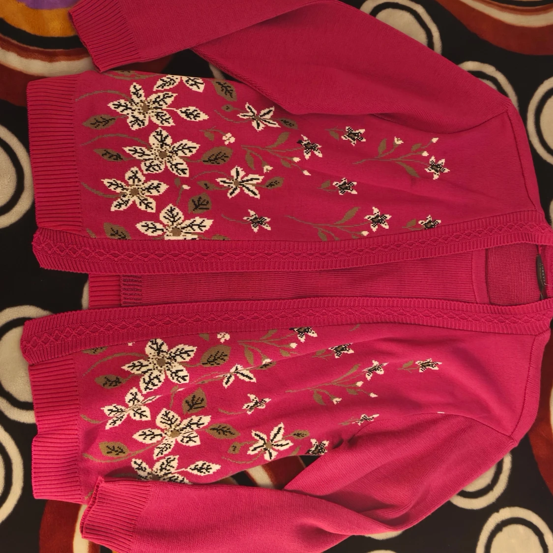Säljer en snygg rosa kofta från Forever by Michael Gold i storlek L/XL. Koftan har ett blommigt mönster i vitt, beige och grönt framtill, ribbade muddar och dekorativ kant. Materialet är stickat och känns mjukt mot huden. Perfekt för dig som gillar färg och detaljer!