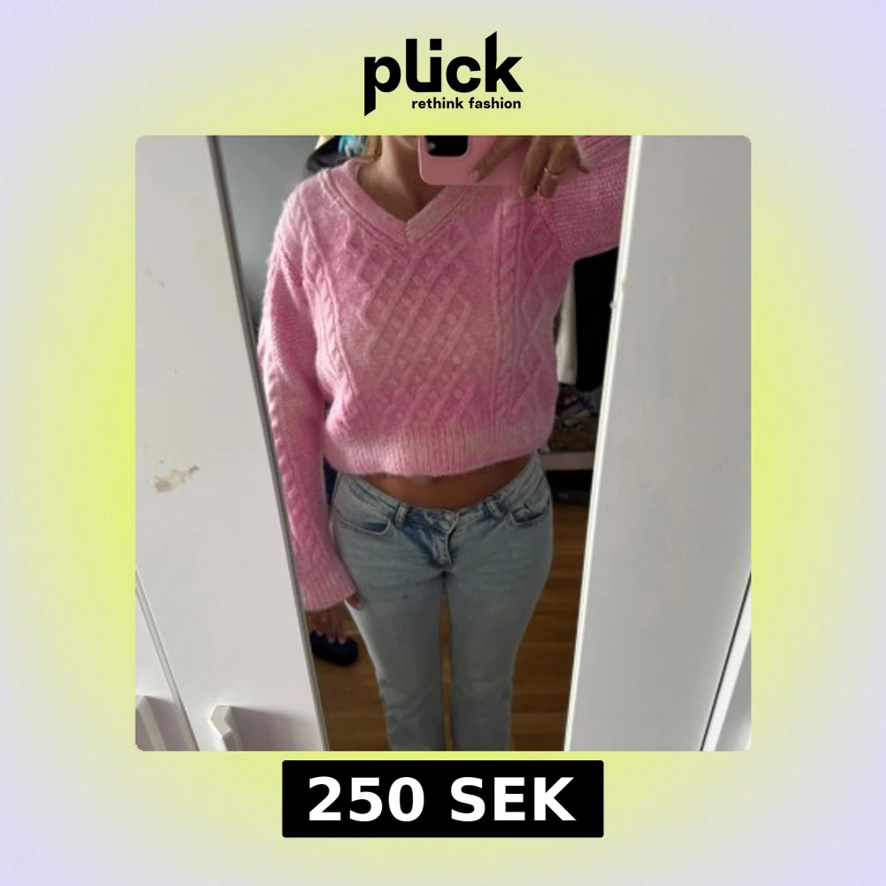 Superfin rosa stickad tröja från MNG med v-ringning och kabelstickat mönster. Croppad modell med långa ärmar och ribbade muddar. Gjord i återvunnen polyester, perfekt för dig som gillar en söt och trendig look.