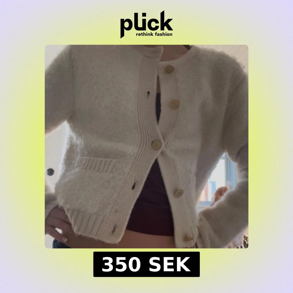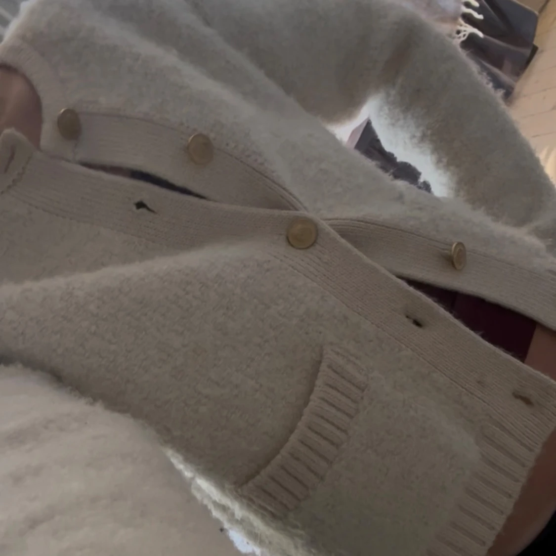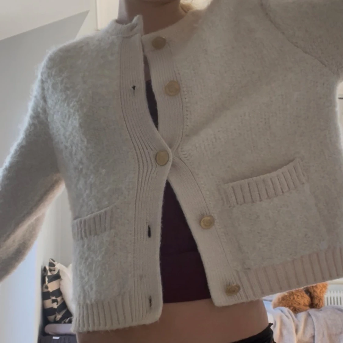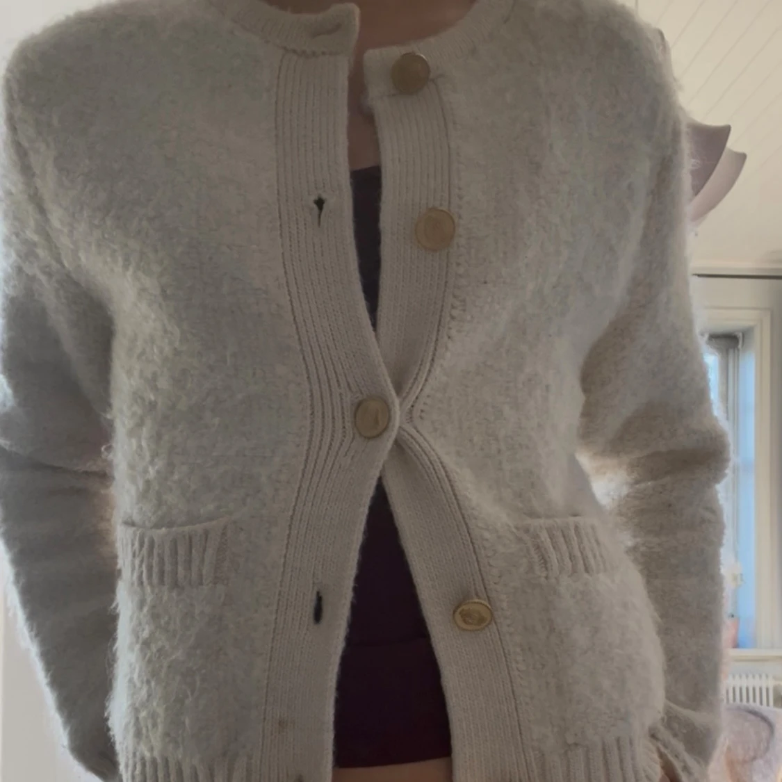Mysig beige stickad kofta med guld knappar, och två fickor framtill. Koftan har ribbade detaljer vid kanter och fickor.❤️ny skick skulle säga att den passar dom som har xs-s