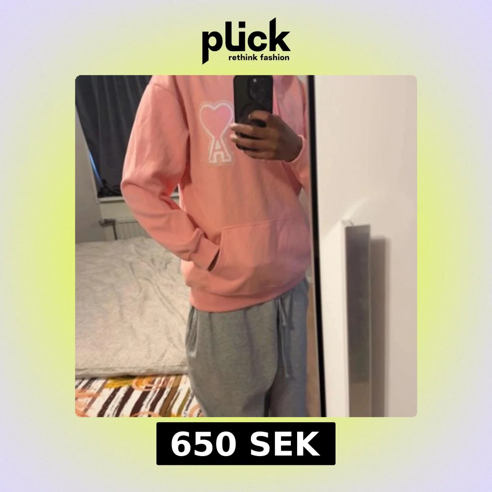 Säljer en snygg rosa hoodie från Ami med broderad hjärtdetalj och bokstaven A på bröstet. Hoodien har huva med snörning, stor magficka och långa ärmar. Perfekt för dig som gillar chill och stilren streetwear.