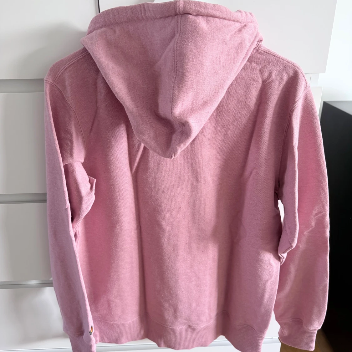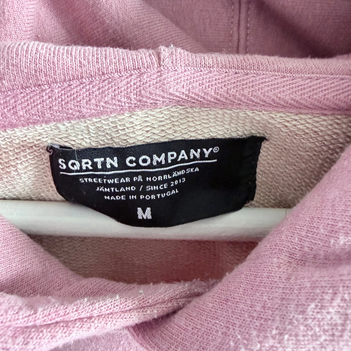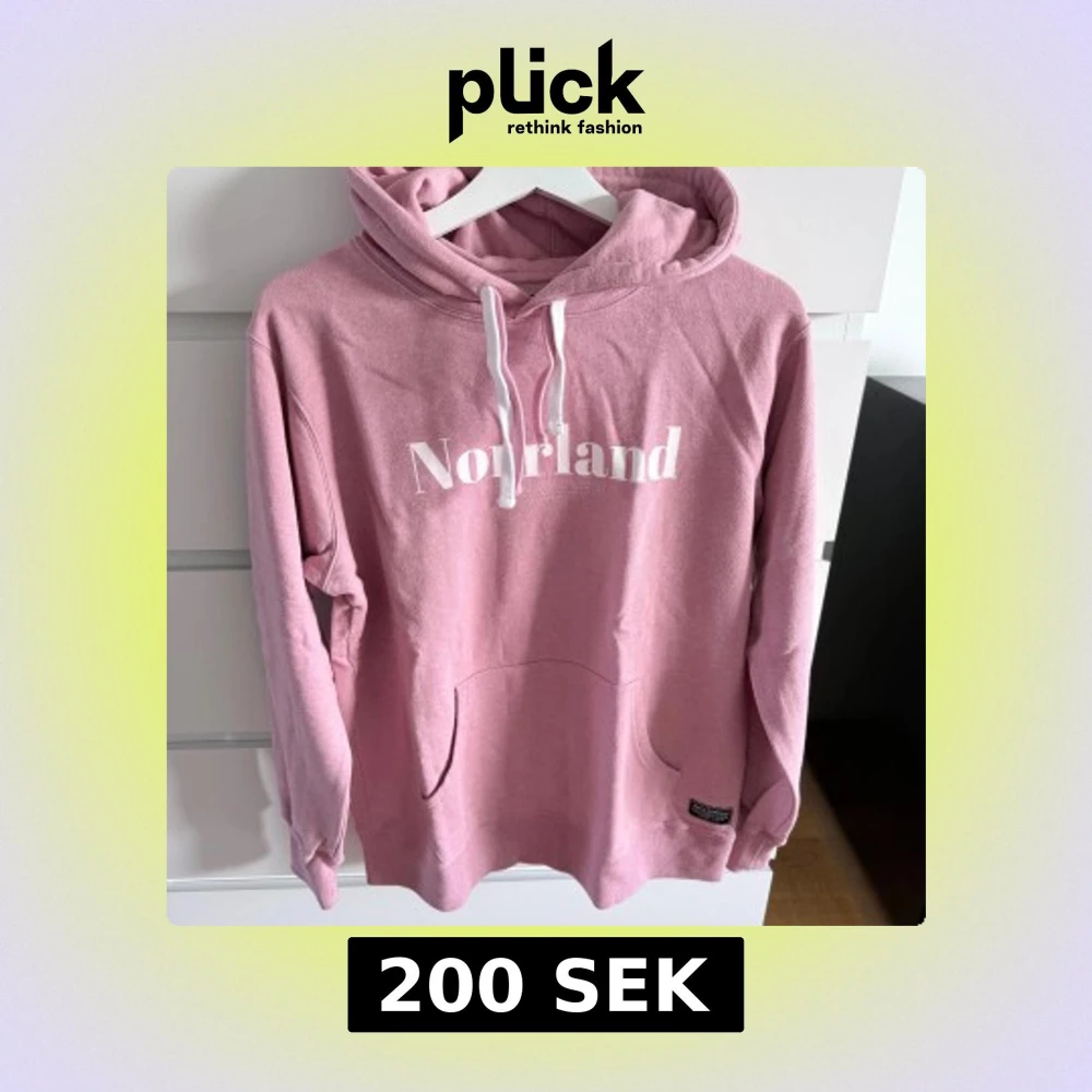 Säljer en rosa hoodie från SORTN COMPANY med vit text 'Norrland' på bröstet. Tröjan har huva med vita snören, känguruficka och är tillverkad i mjuk bomull. Perfekt för dig som gillar streetwear och vill ha en chill look.