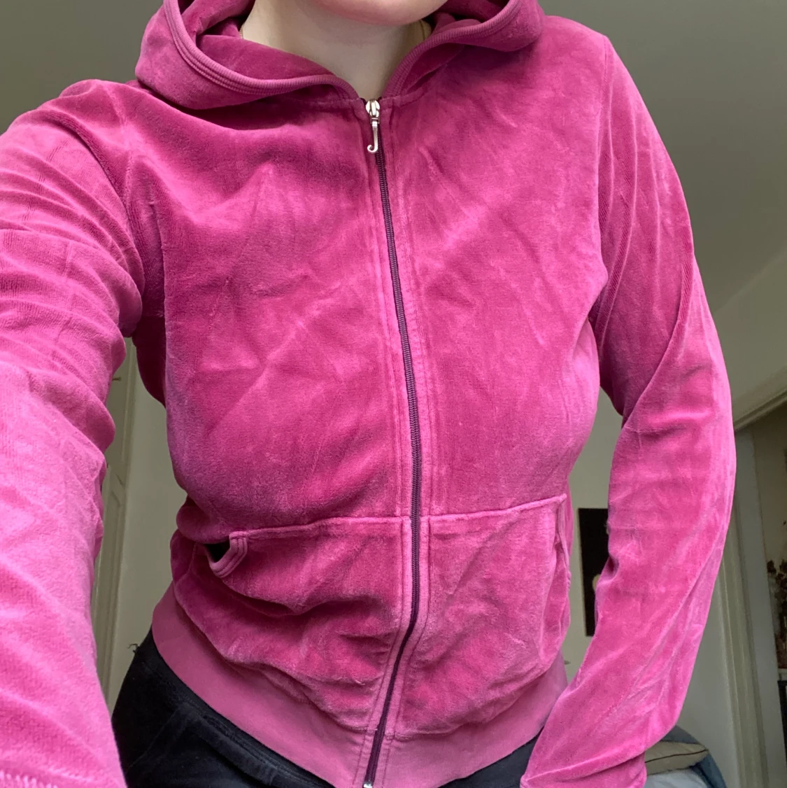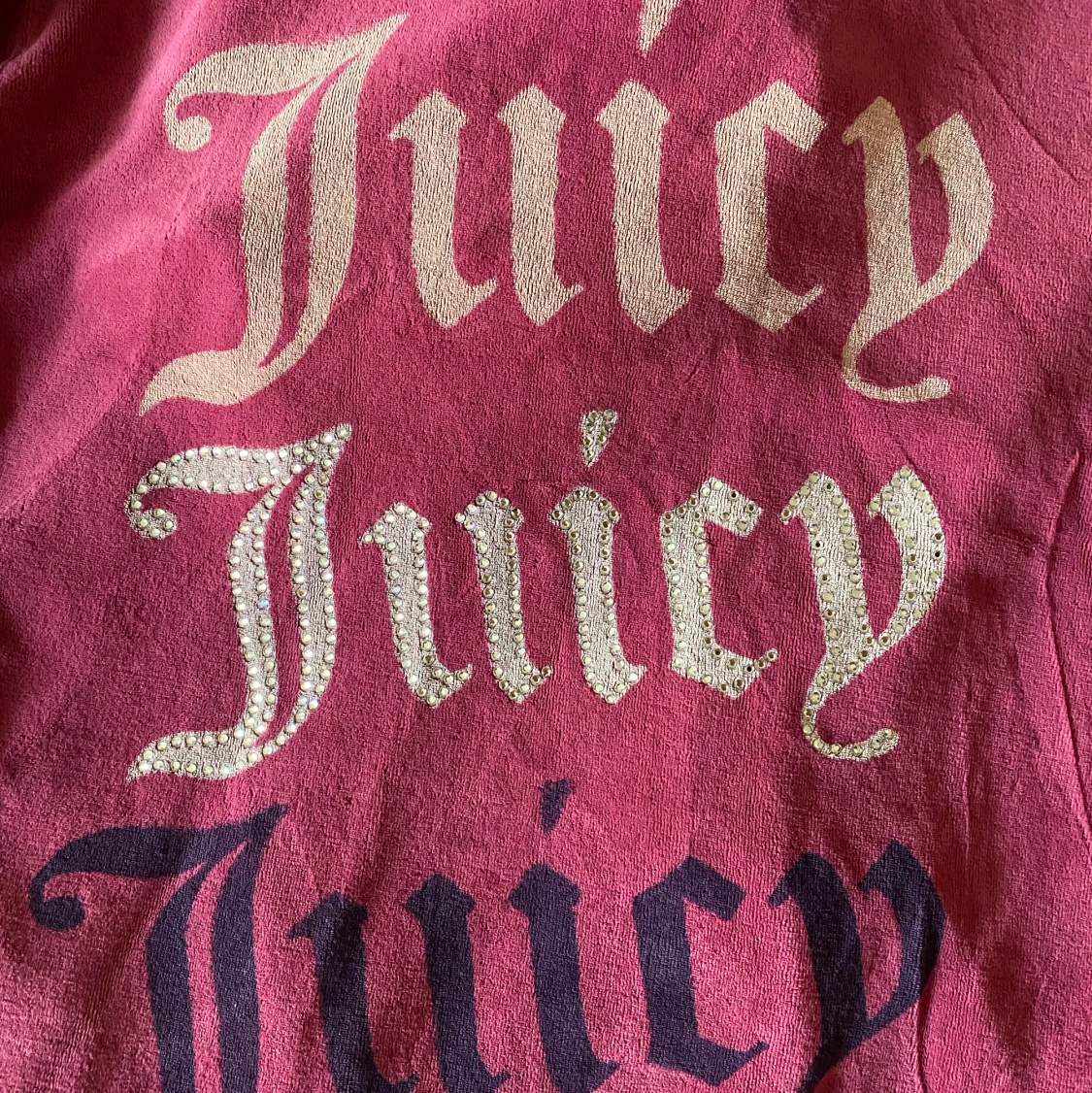 Superfin mörkrosa Juicy Couture kofta/hoodie/tröja. Silvriga detaljer i toppskick och inga avlossande stenar från trycket på ryggen. XL men passar perfekt en S/M ändå.