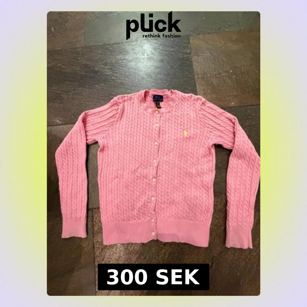 Säljer en rosa kabelstickad kofta från Polo Ralph Lauren med klassisk gul logga på bröstet. Koftan har rund hals, långa ärmar och pärlemorknappar framtill. Perfekt för lager på lager och ger en preppy look.