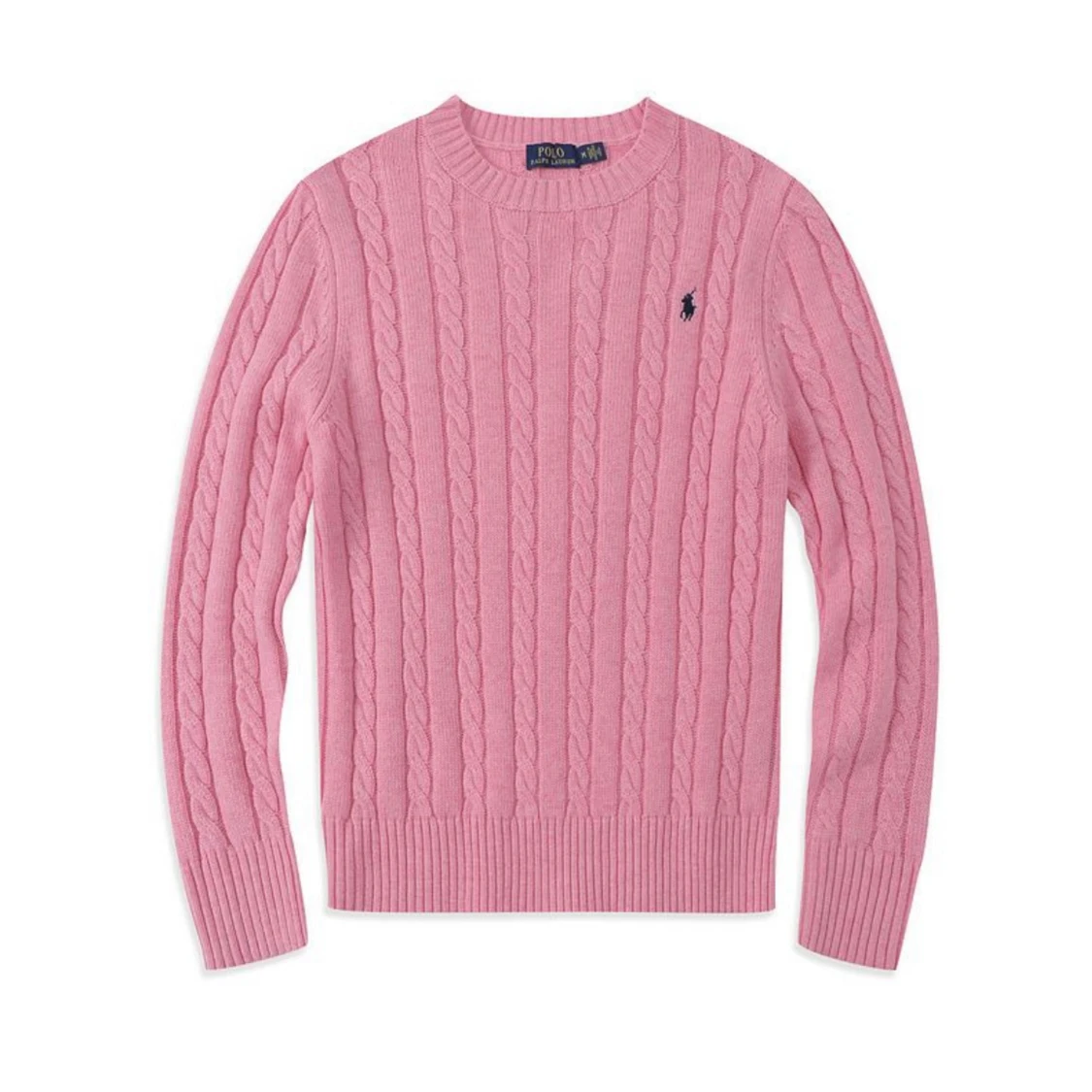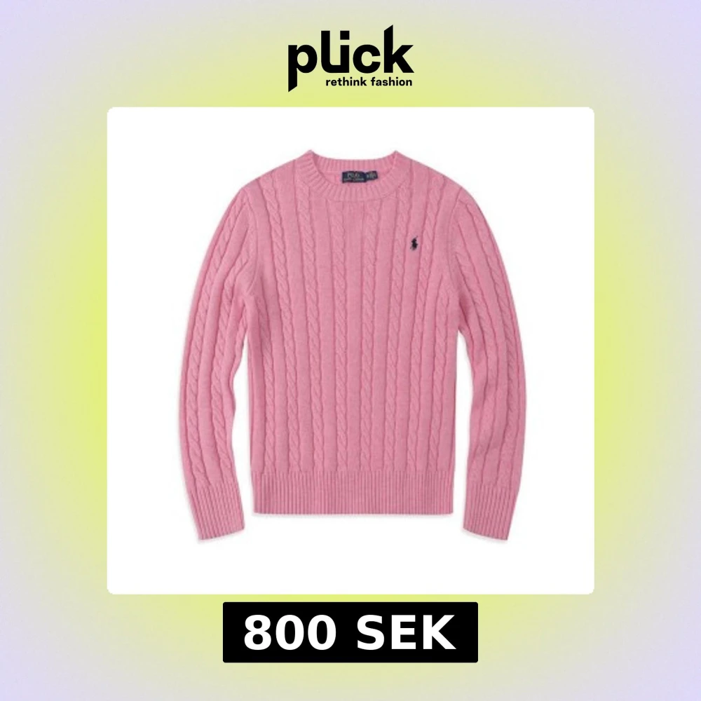 Säljer en rosa kabelstickad tröja från Polo Ralph Lauren med klassisk rund halsringning och broderad logga på bröstet. Tröjan har långa ärmar och ribbade muddar för en snygg passform. Perfekt för dig som gillar stil