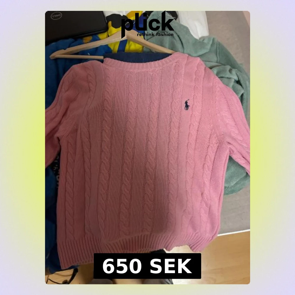 Säljer en rosa kabelstickad tröja från Polo Ralph Lauren med klassisk broderad logga på bröstet. Tröjan har rund hals, ribbade muddar och långärmad passform. Perfekt för dig som gillar preppy stil och vill ha något som sticker ut.