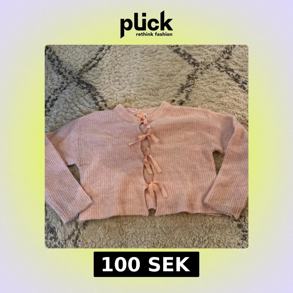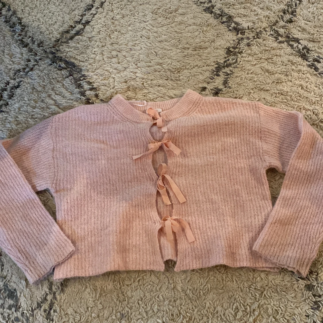 Supergullig ljusrosa kofta med ribbad struktur och fyra söta rosetter framtill som knäppning. Långärmad och croppad modell, perfekt för lager på lager. Mjuk och mysig känsla, passar till både jeans och kjol.