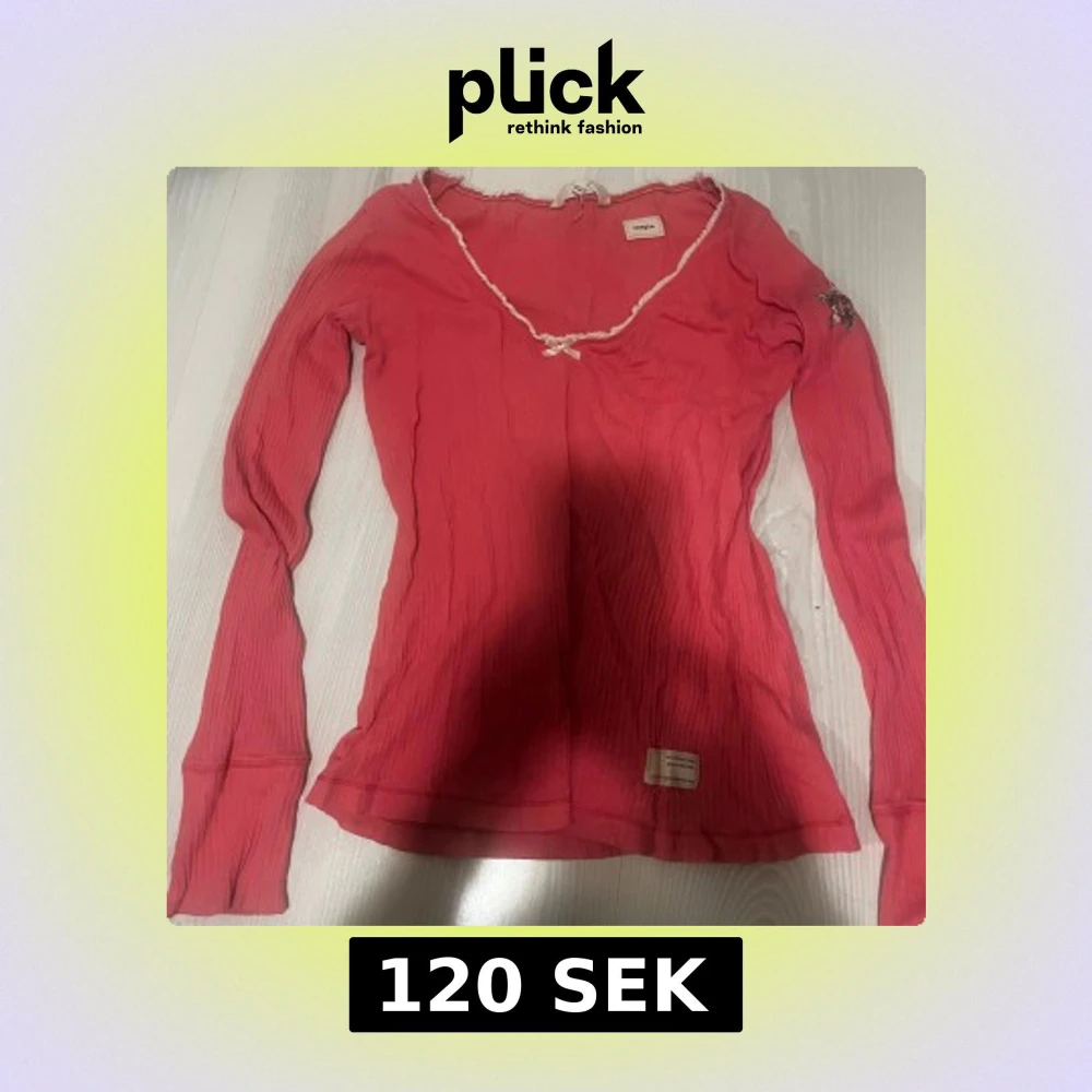 Supersöt rosa långärmad topp från odd molly med ribbad struktur och v-ringad hals med spetskant och liten rosett. På ena ärmen finns ett coolt hjärtmönster med stjärna och vingar som defenerar odd Molly märket.
