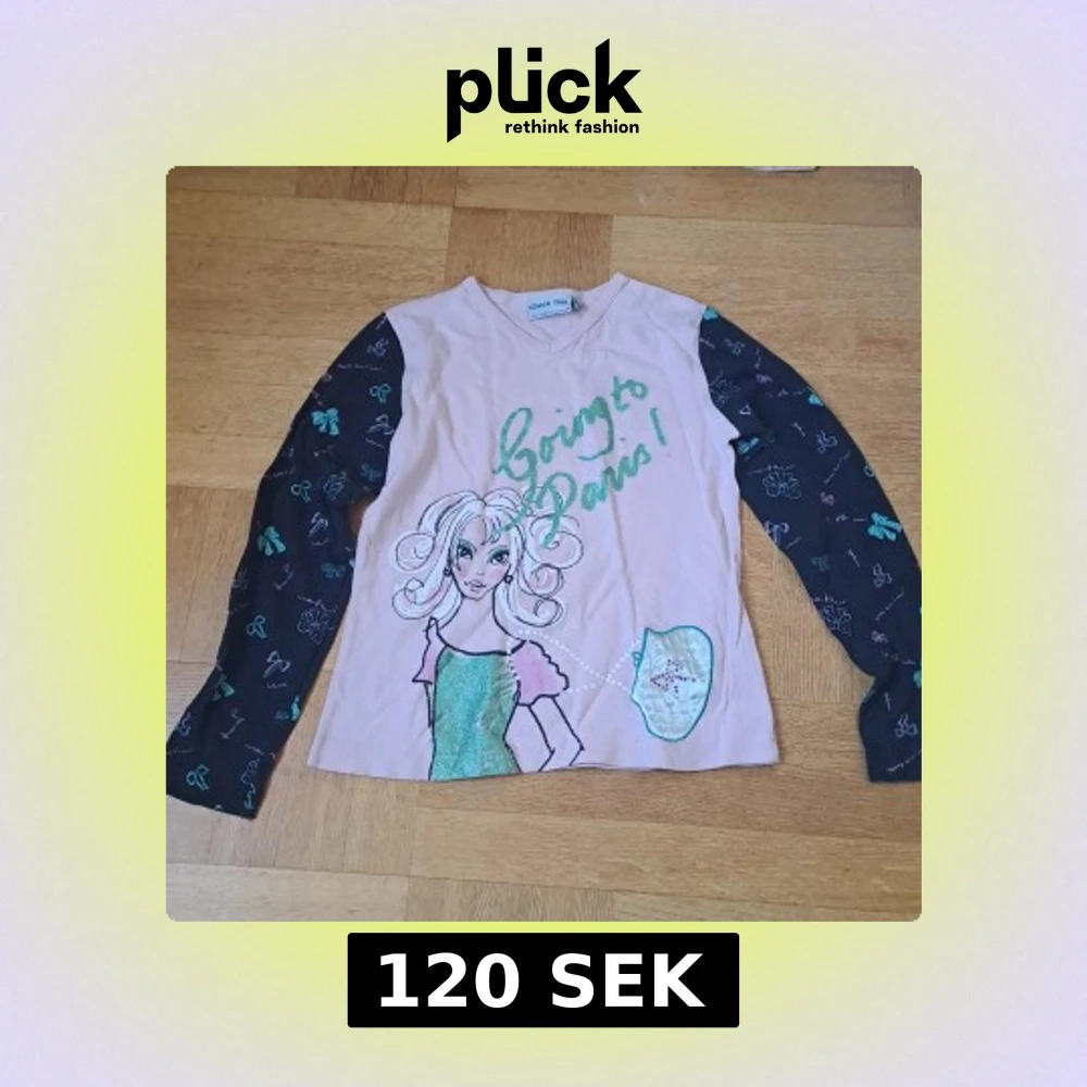 Söt rosa långärmad tröja från Check This by Lindex Girls med svarta ärmar dekorerade med färgglada rosetter. Framsidan har ett tryck med texten 'Going to Paris!' och en tecknad figur. Tröjan är i mjuk bomull och har v-ringning. Är barnstorlek 145/152 men passar xs, eventuellt s. 🩷