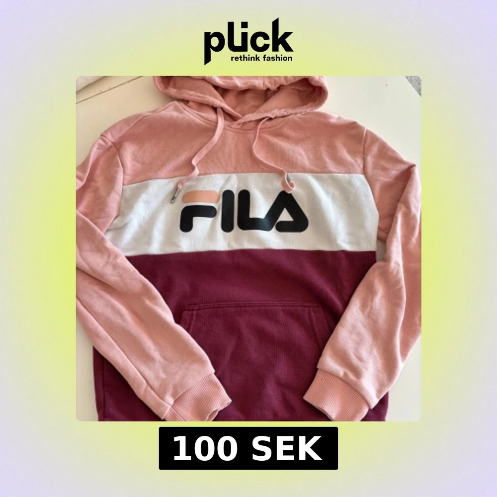 Säljer en snygg hoodie från Fila i rosa och vinrött med vit panel och logga på bröstet. Tröjan har justerbar huva med dragsko. Perfekt för en avslappnad stil!