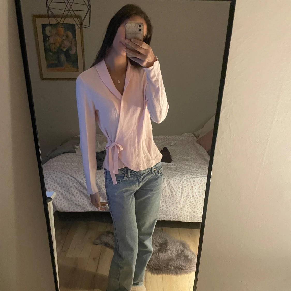 Säljer en söt rosa omlottopp med knytband i midjan. Toppen har långa ärmar och en v-ringad design som ger en elegant touch. Perfekt för en avslappnad men stilren look.