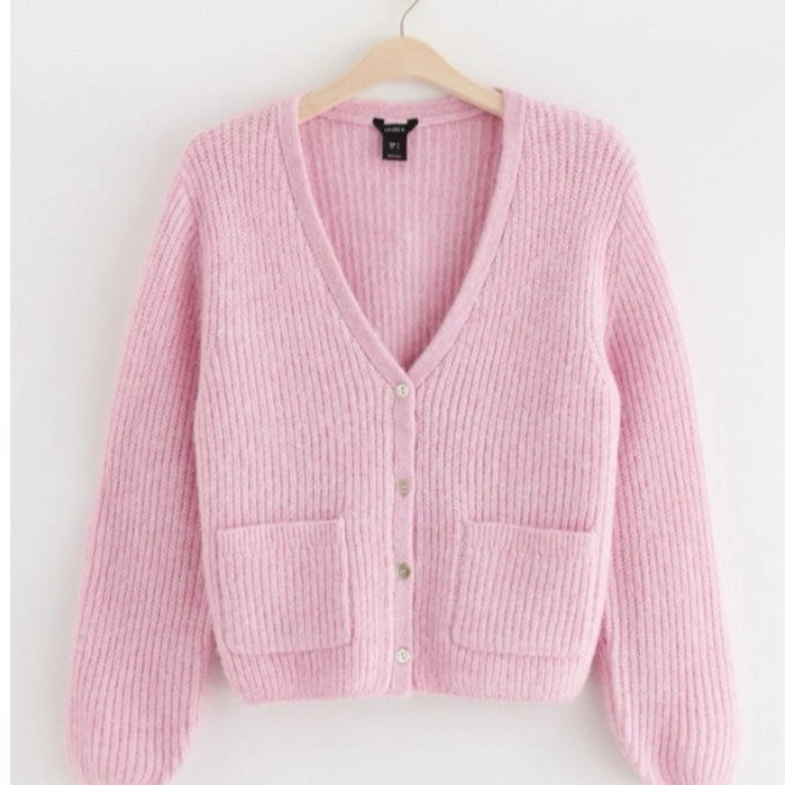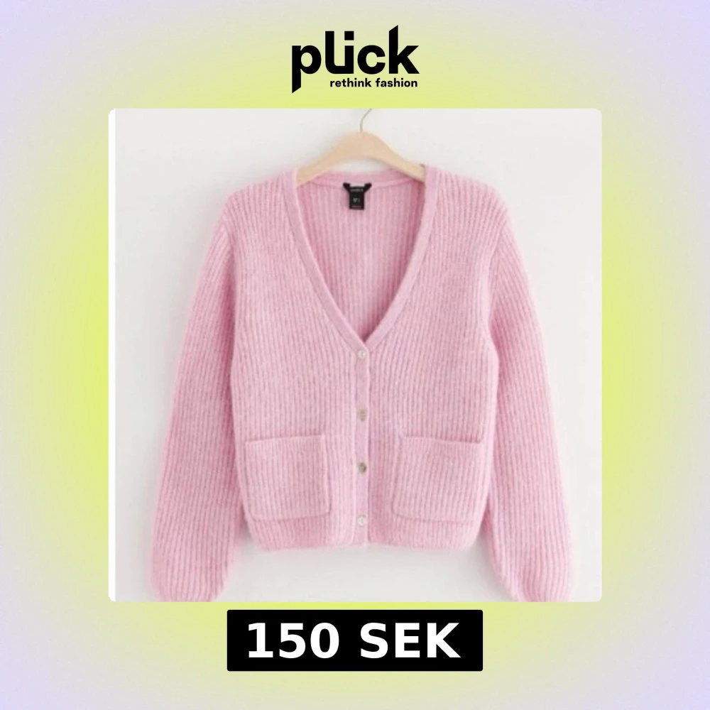 Superfin ljusrosa kofta från Monki med ribbad stickning, v-ringning och knappar framtill. Tröjan har två stora fickor och långa ärmar. Perfekt att slänga över en t-shirt för en chill look.