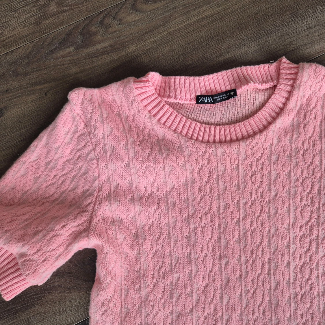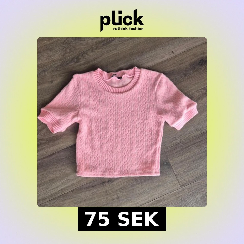 Superfin rosa stickad crop topp från ZARA med korta ärmar och ribbade kanter vid halsringning och ärmslut. Perfekt för en söt och trendig look. Mjukt material och diskret mönster i tyget. Aldrig använd passar även nån med storlek s