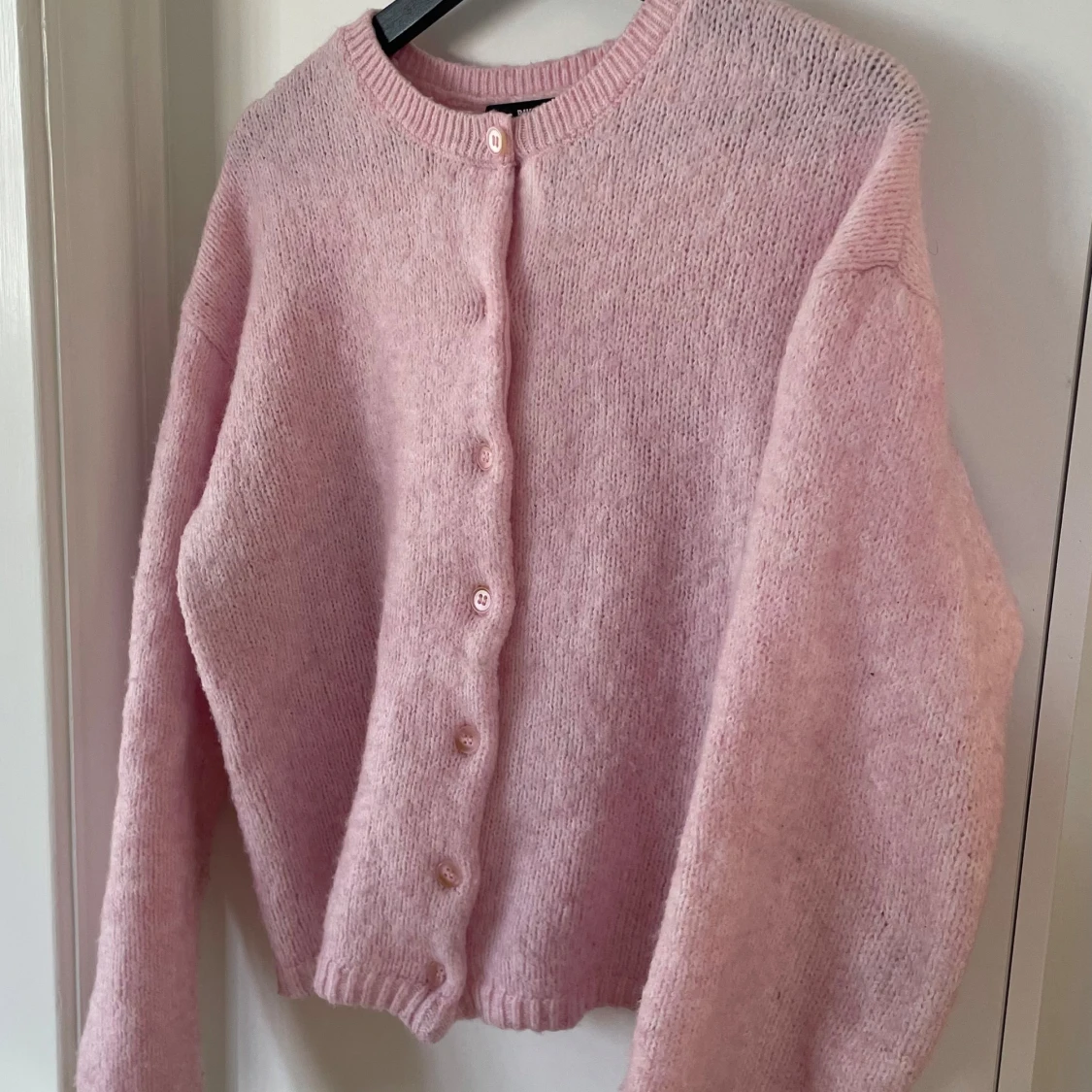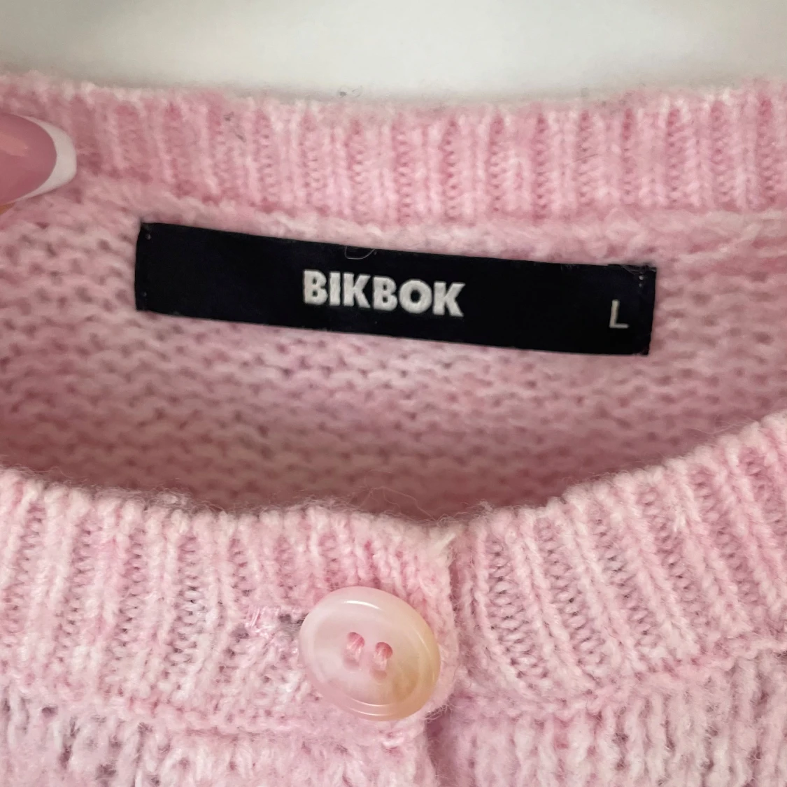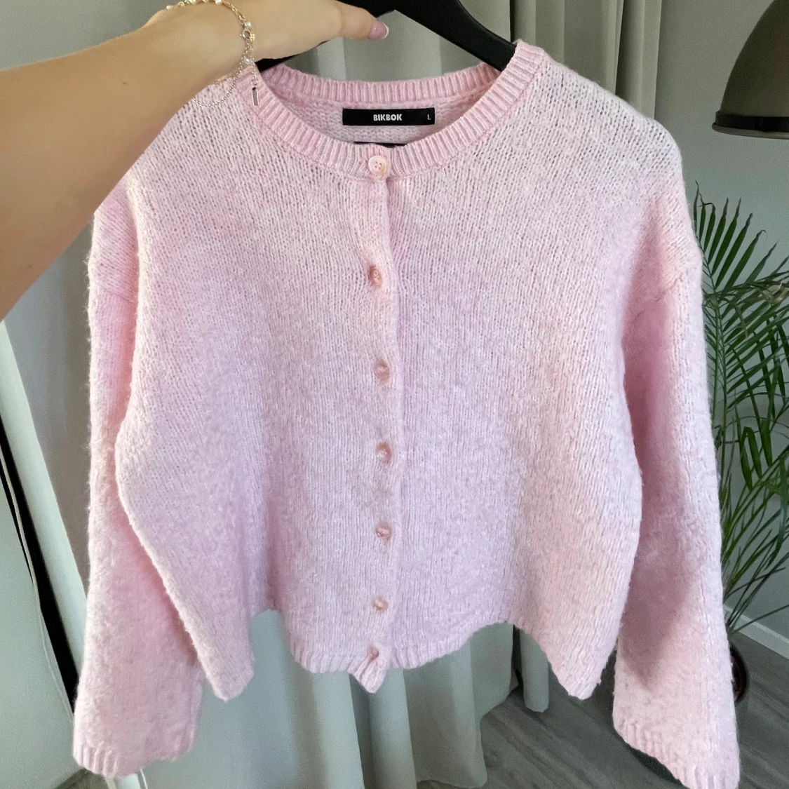 Mysig rosa stickad kofta från BikBok med knappar framtill. Perfekt för kyliga dagar och ger en söt touch till din outfit. Koftan har långa ärmar och en rund halsringning. Sitter som en S/M. Liten i storleken.