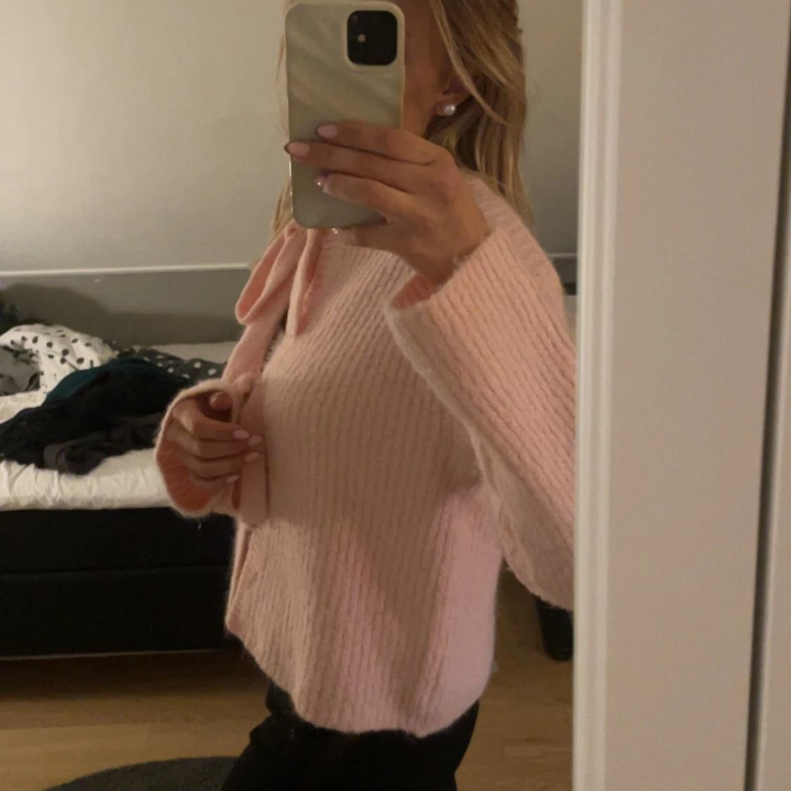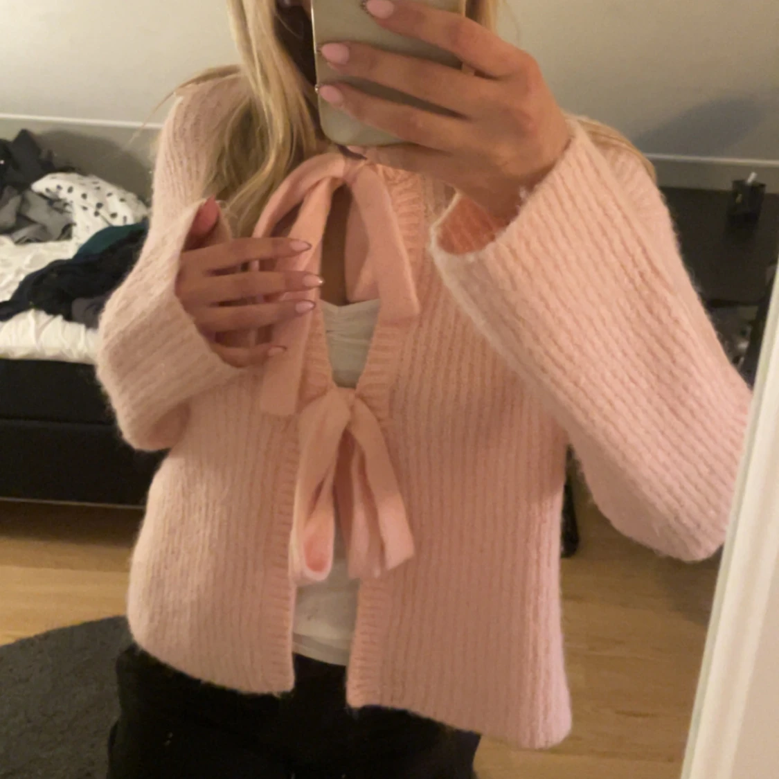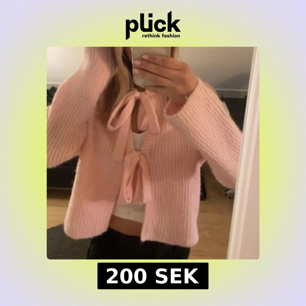 Supergullig ljusrosa stickad kofta med två stora rosetter framtill. Koftan har lång ärm och är lite croppad i modellen. Perfekt för dig som gillar en söt och trendig look. Mjuk och mysig att ha på sig.