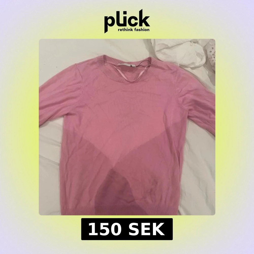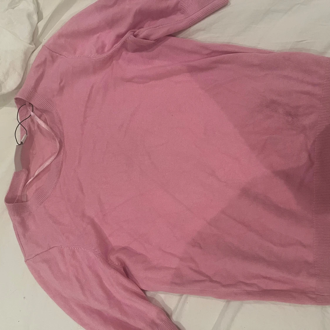Säljer en enkel och mjuk rosa stickad tröja med rund halsringning. Tröjan har långa ärmar och ribbade muddar vid ärmslut och nederkant. Perfekt för lager-på-lager och passar till många olika stilar.