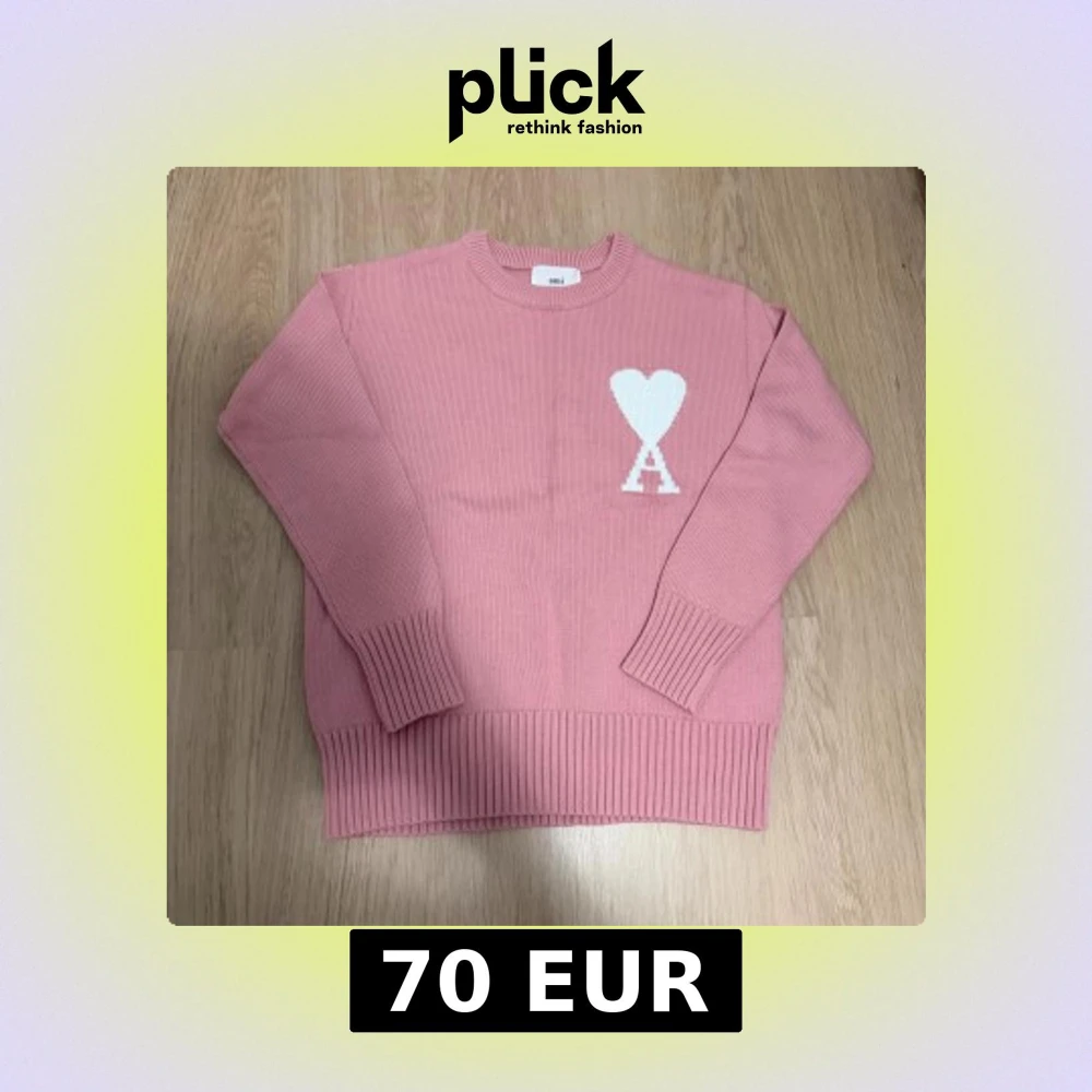 Säljer en rosa stickad tröja från Ami Alexandre Mattiussi med vit hjärt- och A-logga på bröstet. Tröjan har rund halsringning, ribbade muddar och är långärmad. Perfekt för dig som vill ha en snygg och trendig look. Size S