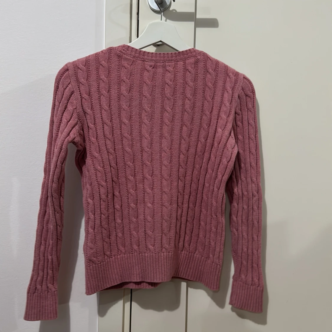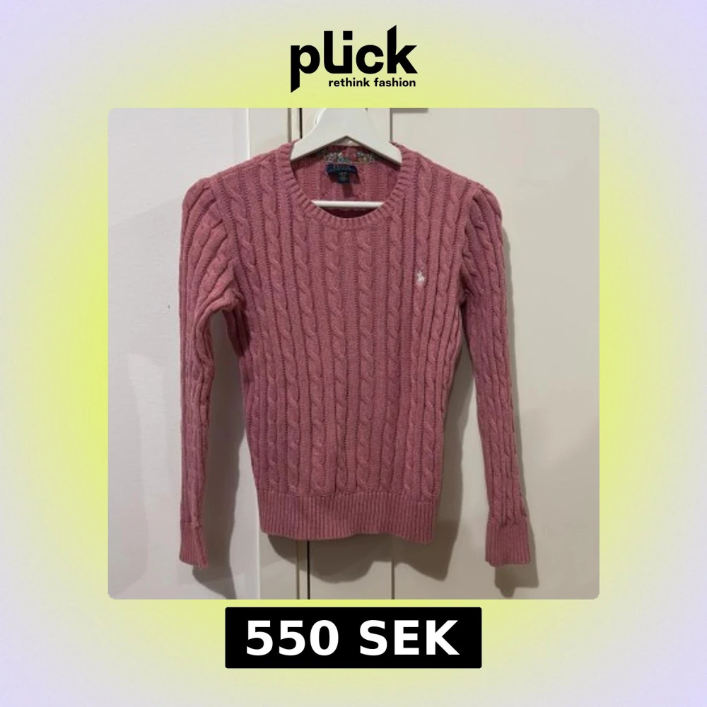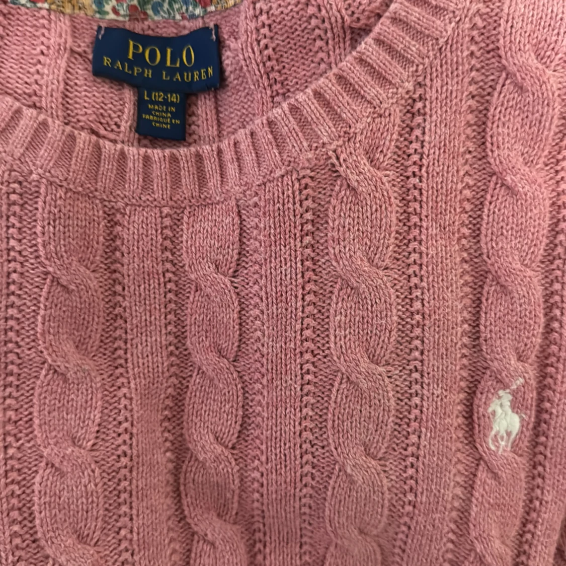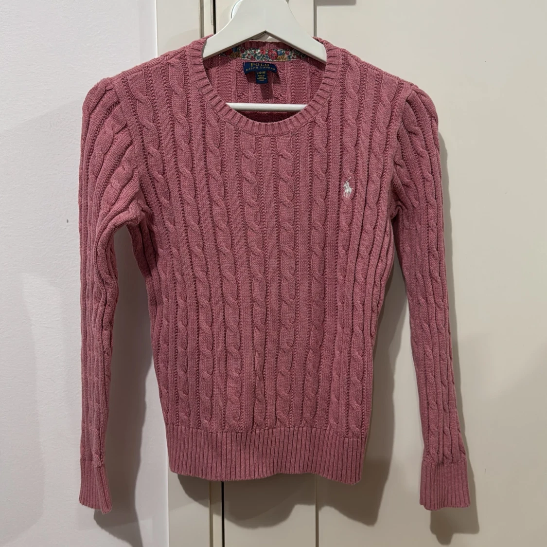 Säljer en snygg rosa stickad tröja från Ralph Lauren med kabelstickat mönster. Tröjan har långa ärmar och en rund halsringning. Tröjan är i väldigt bra skick.