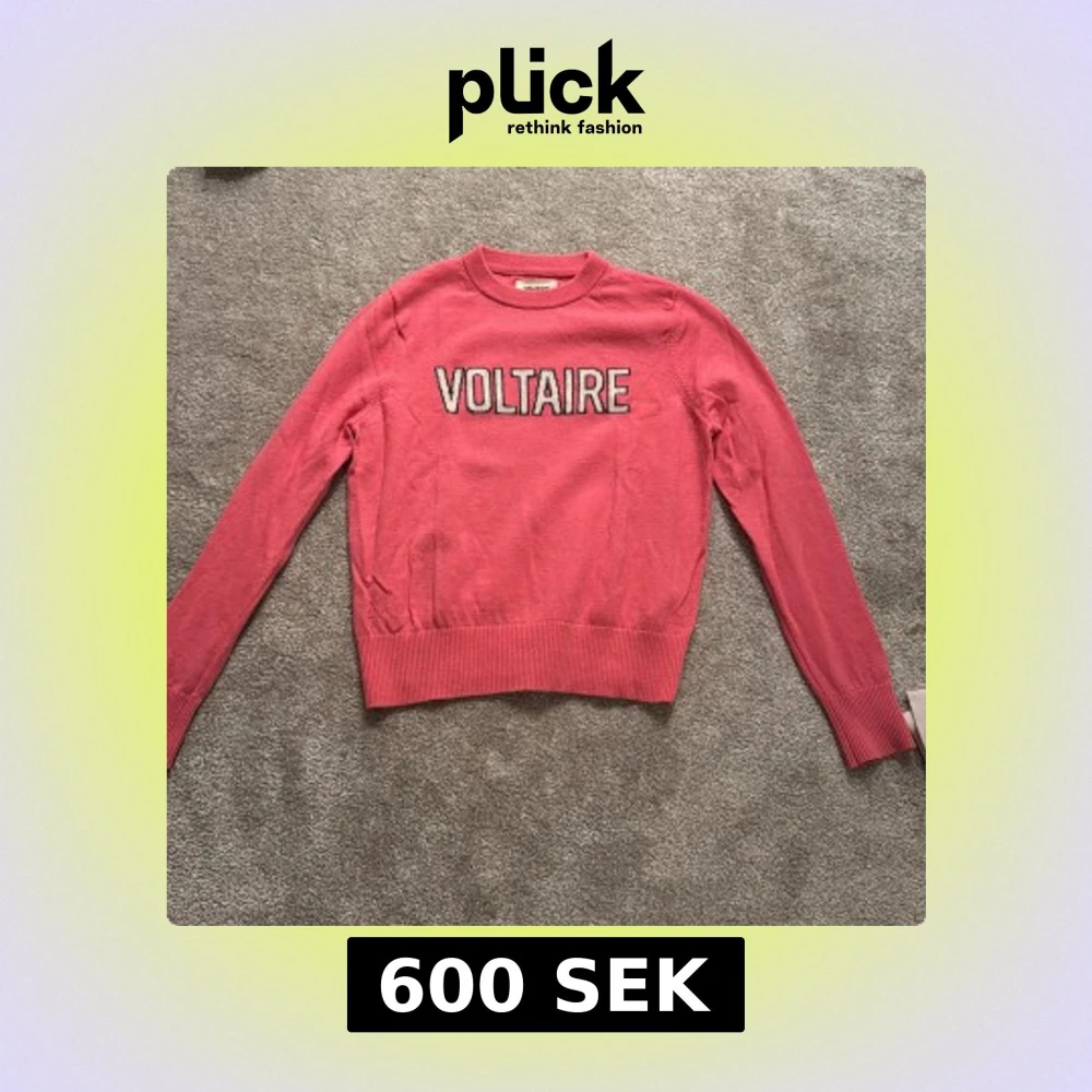 Säljer en rosa stickad tröja från Zadig & Voltaire med texten VOLTAIRE broderad framtill. Tröjan har rund halsringning och långa ärmar. Perfekt för dig som vill ha en snygg statementtröja!
