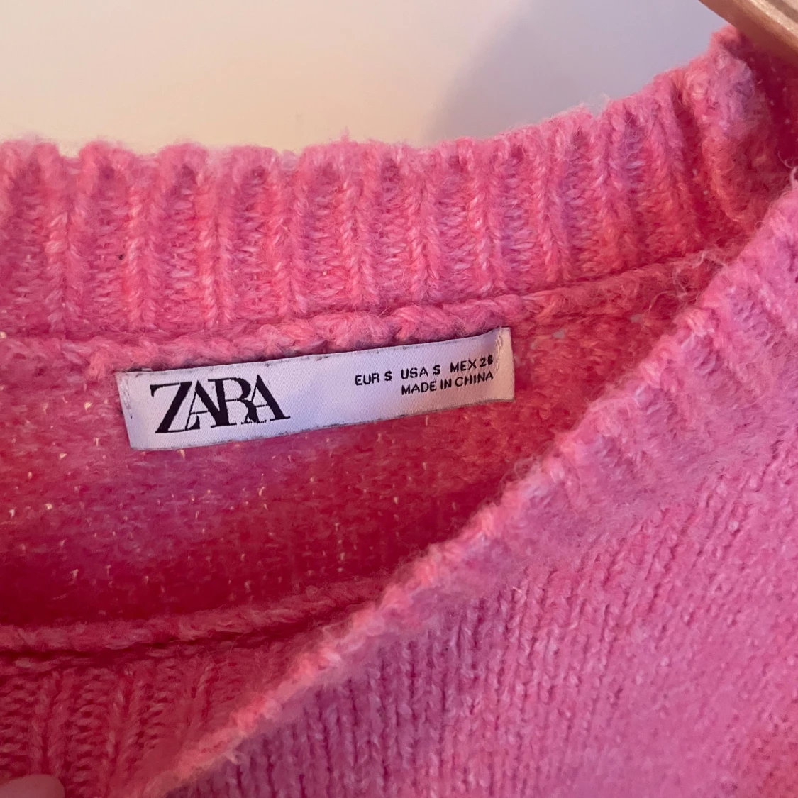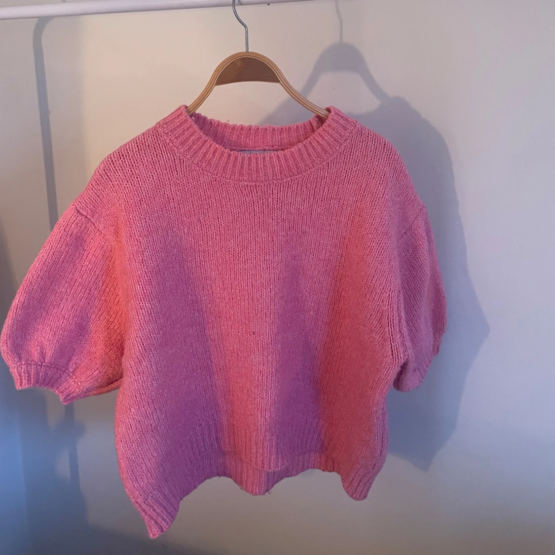 Säljer en söt rosa stickad tröja från Zara. Den har en avslappnad passform med korta ärmar och ribbade kanter vid hals och nederkant. Perfekt för en mysig dag! 💖