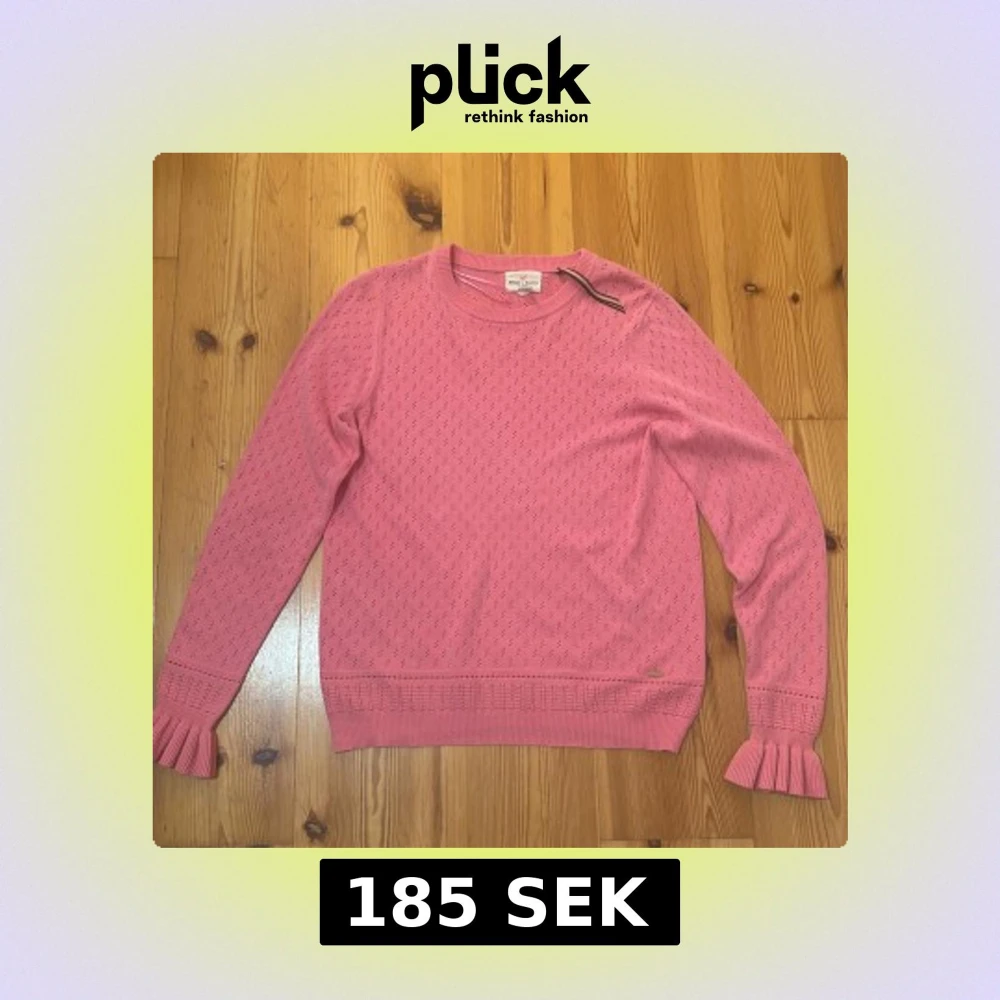 Supersöt rosa stickad tröja från Holly & Whyte med diskret hålmönster och volangdetaljer vid ärmsluten. Storlek M. Säljs då den inte används längre.