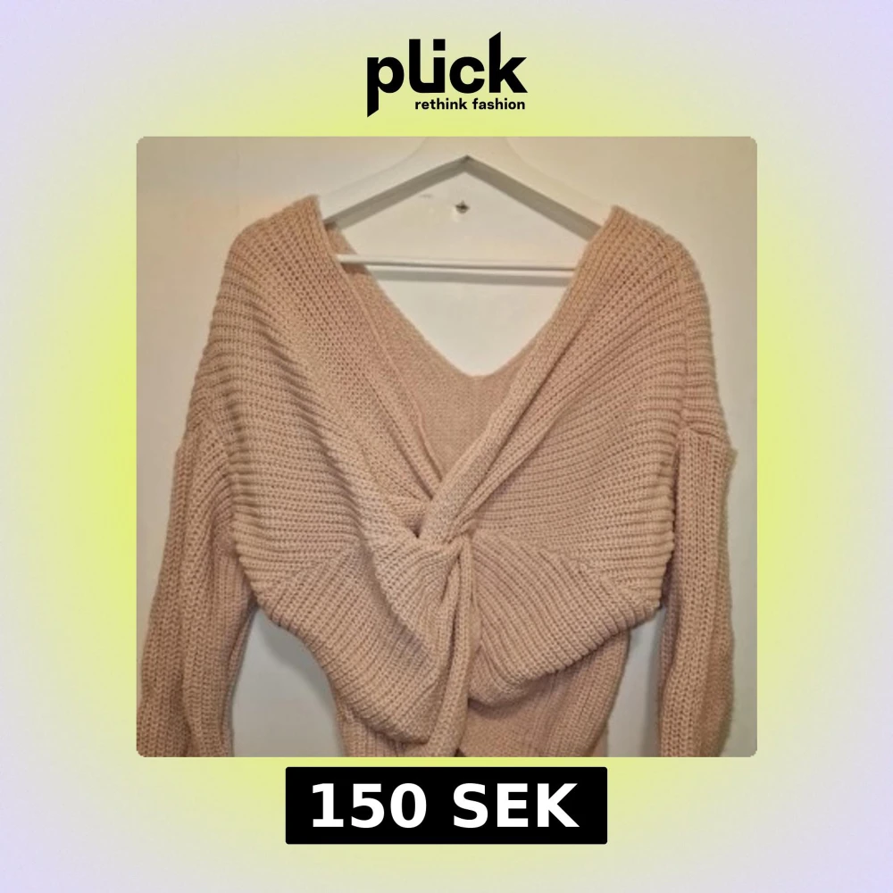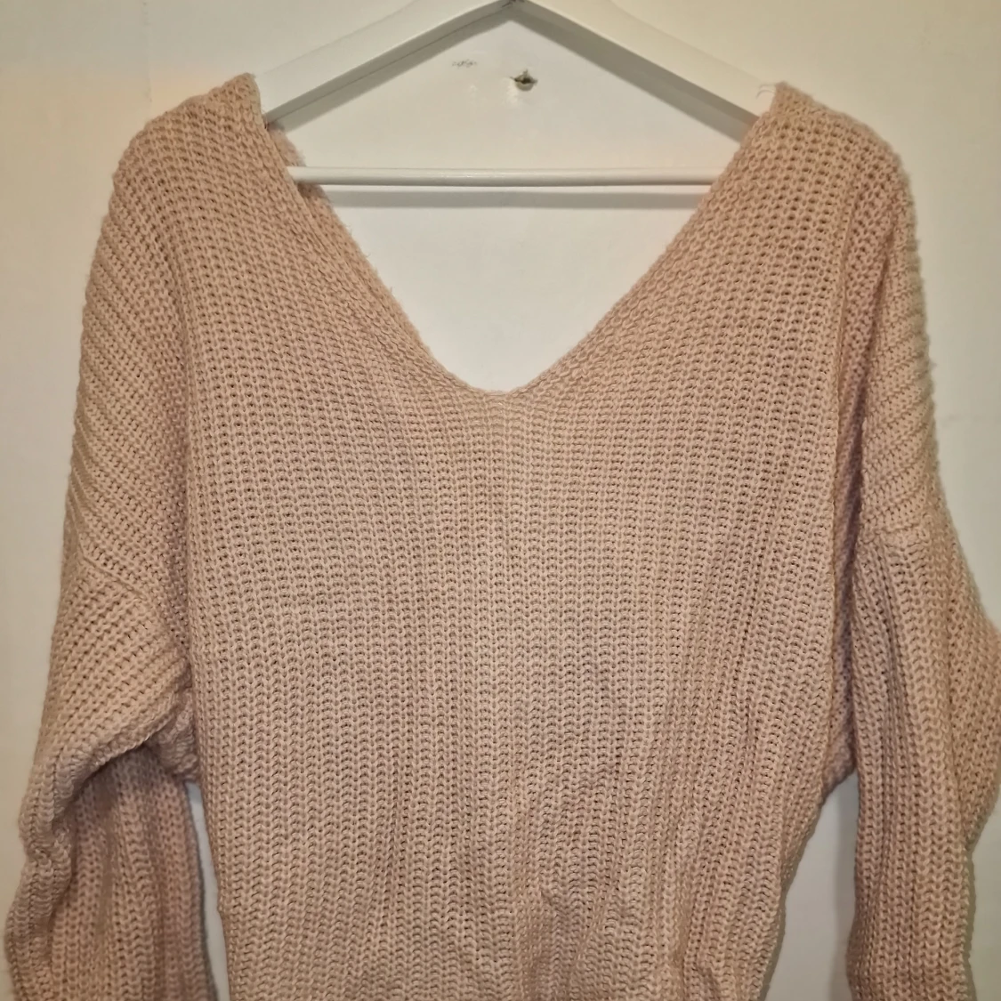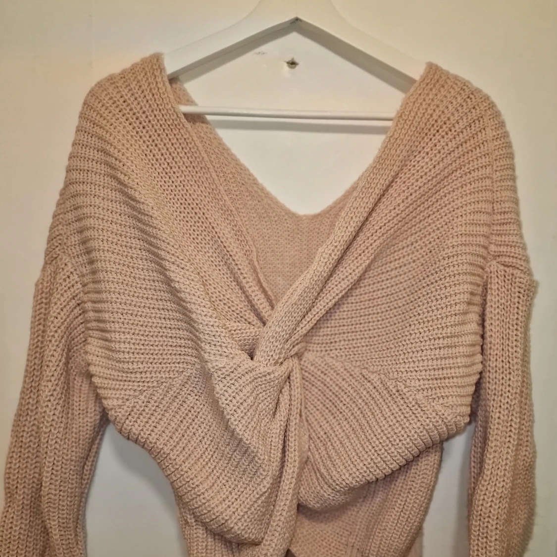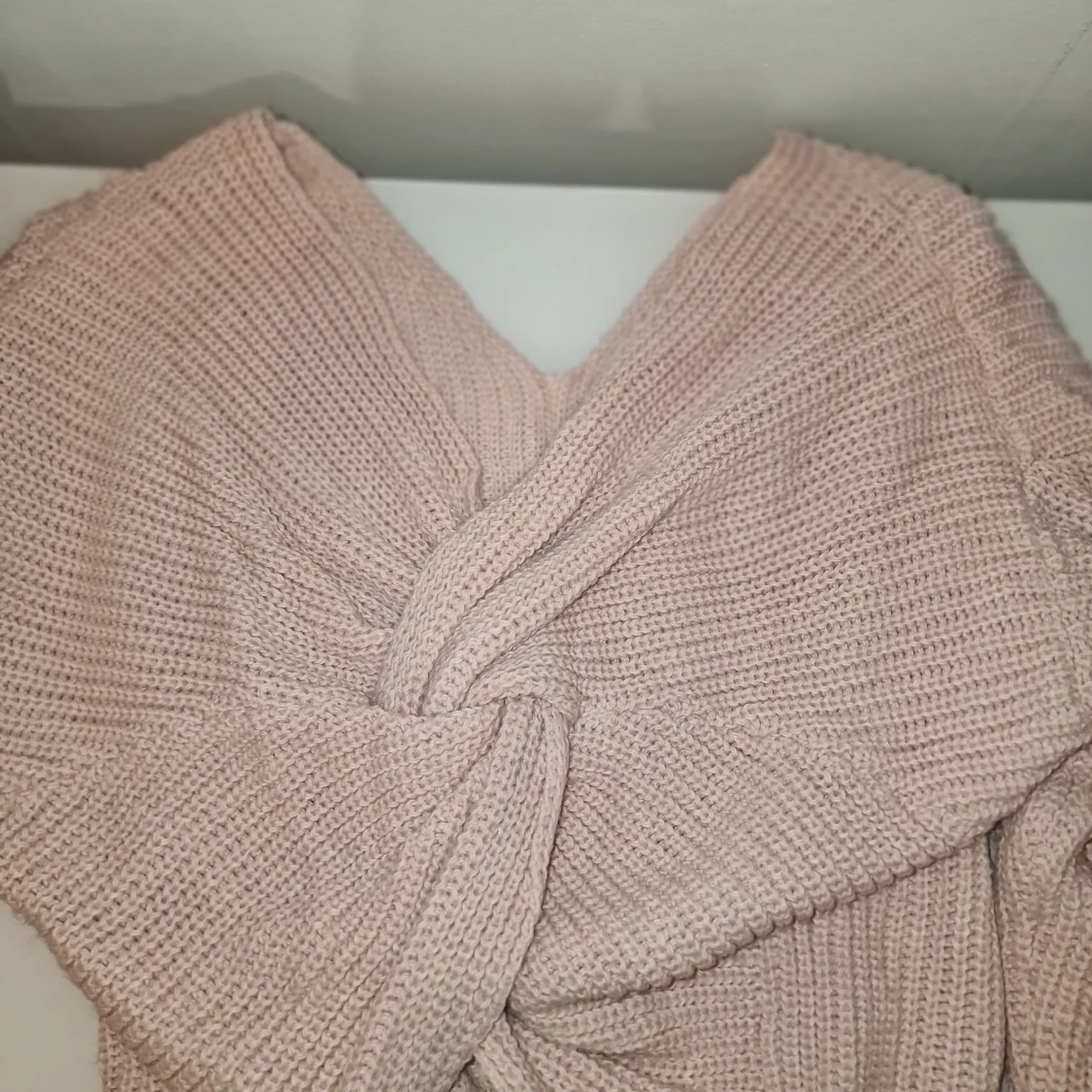 Säljer en mysig rosa stickad tröja med unik knytning baktill. Tröjan har en v-ringad design och långa ärmar, perfekt för kyligare dagar. Den är både romantisk och bekväm, ett måste i garderoben!