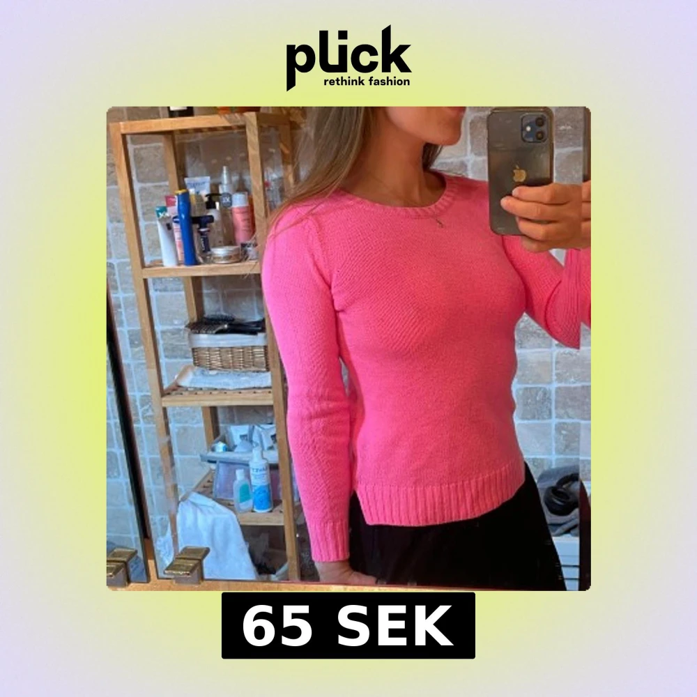 Säljer en snygg rosa stickad tröja med rund halsringning och ribbade muddar vid ärmslut och nederkant. Tröjan har lång ärm och en klassisk, enkel design som är lätt att matcha till olika outfits.