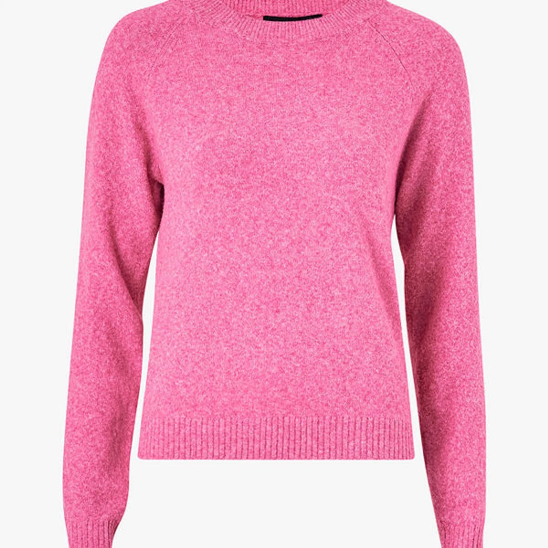 En snygg rosa stickad tröja med rund halsringning och långa ärmar. Tröjan har ribbade muddar vid ärmslut och nederkant, vilket ger en klassisk och stilren look. Perfekt att matcha med jeans eller kjol för en trendig outfit.