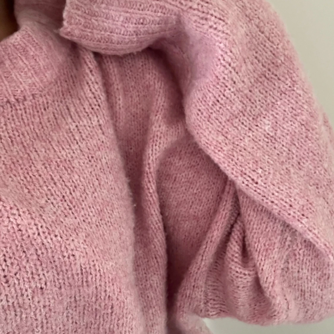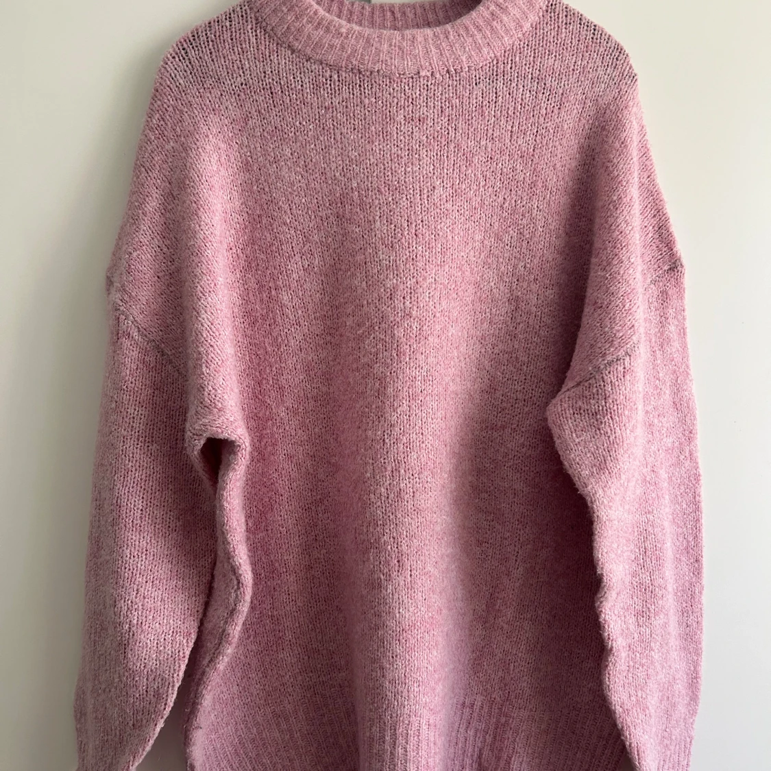 Mysig rosa stickad tröja med rund hals och långa ärmar. Perfekt för kyliga dagar när du vill hålla dig varm och bekväm. Tröjan har en enkel och stilren design som passar till många olika outfits.