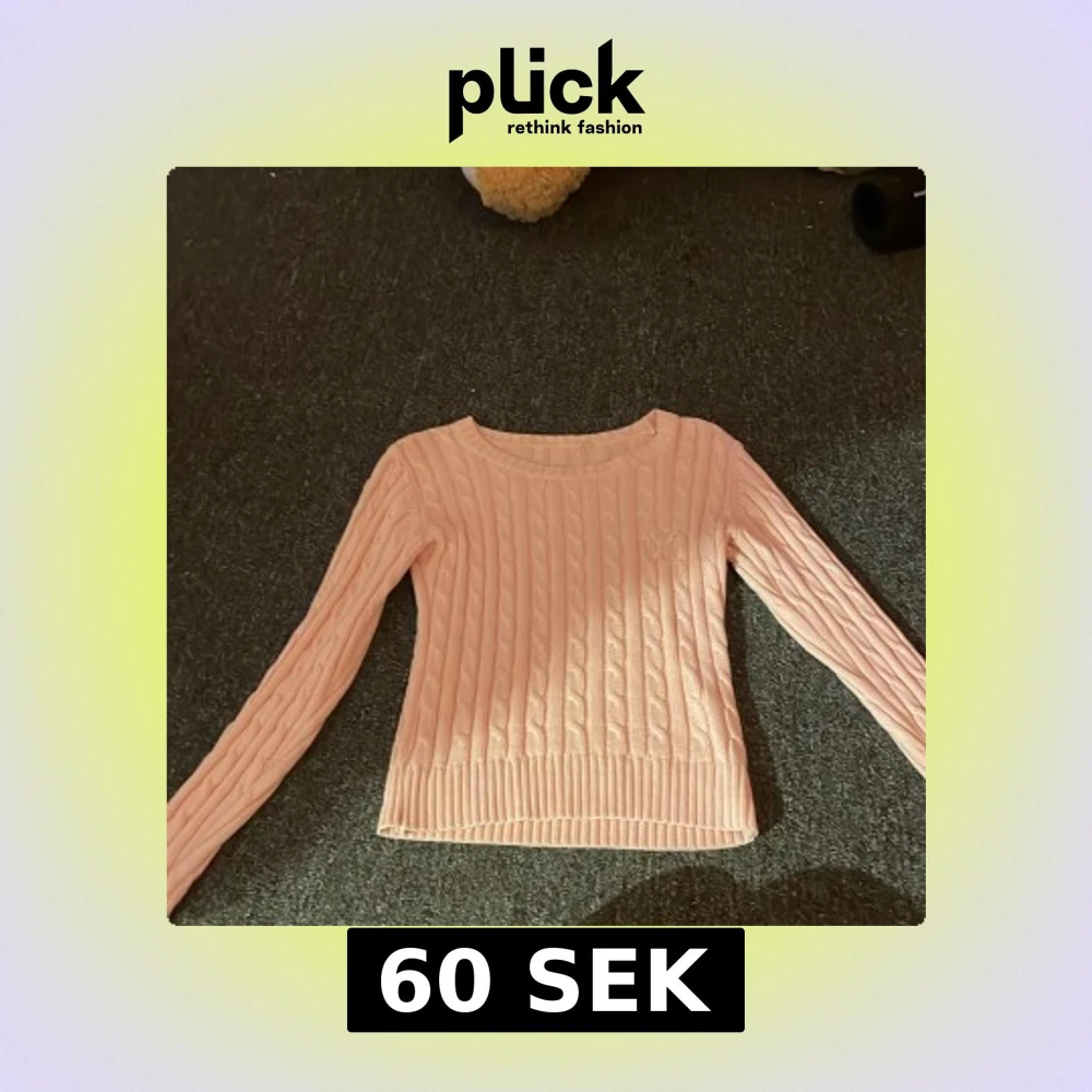 Supersöt ljusrosa kabelstickad tröja med rund halsringning och långa ärmar. Tröjan har ribbade muddar vid ärmslut och nederkant, vilket ger en snygg och klassisk look. Perfekt för lager-på-lager under kyligare dagar. Vet varken märke eller storlek men skulle säga att den är storlek S, det står CLFD PÅ BRÖSTET