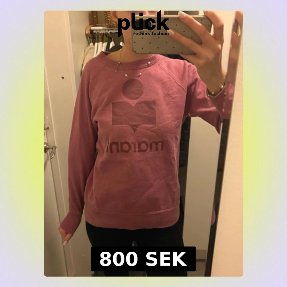 Säljer en snygg rosa sweatshirt från Isabel Marant med det ikoniska logotrycket framtill. Tröjan har rund halsringning, långa ärmar och ribbade muddar vid ärmslut och nederkant. Perfekt för en chill och trendig look. Har en mindre fläck, se bild. Storlek 40 men som 36.