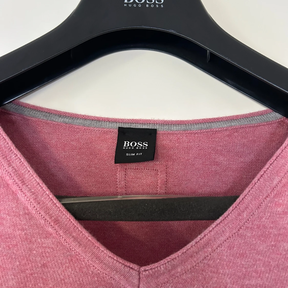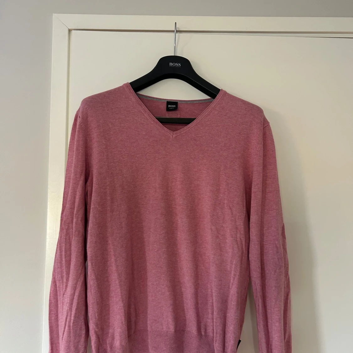 Snygg rosa v-ringad tröja från Hugo Boss i slim fit-modell. Tröjan har långa ärmar och ribbade muddar vid nederkant och ärmslut. Sparsamt använd, storlek L