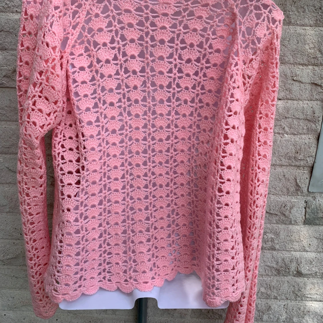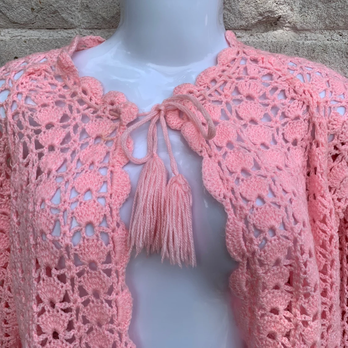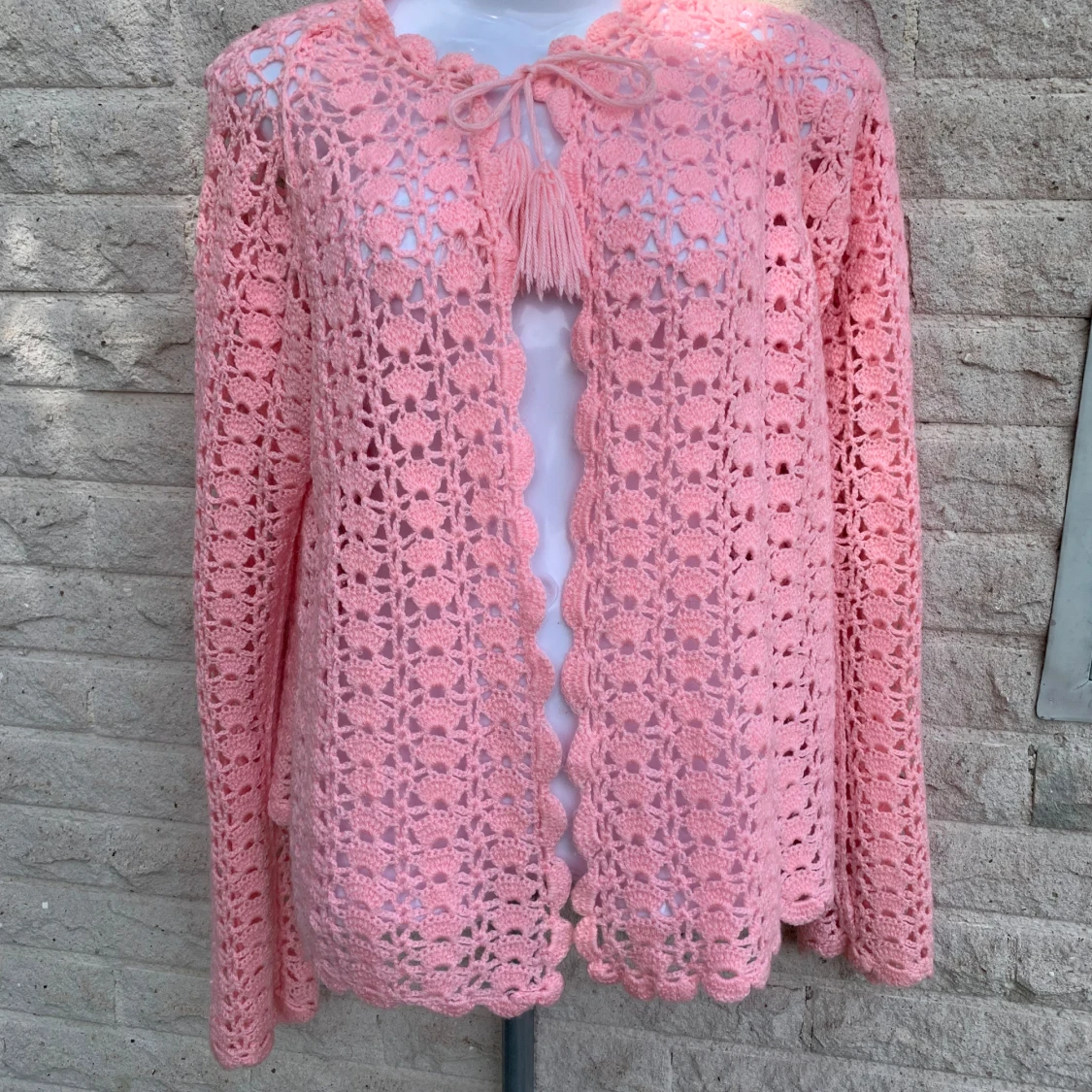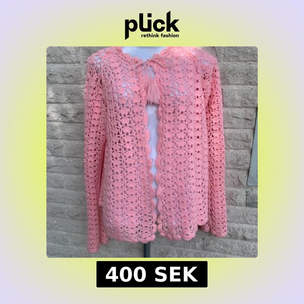 Superfin rosa virkad kofta med långa ärmar och snyggt knytband med tofsar vid halsen. Koftan har ett öppet, luftigt mönster och vågig kant längs öppningen och nederkanten. Perfekt för lager-på-lager och ger en söt, bohemisk vibe.