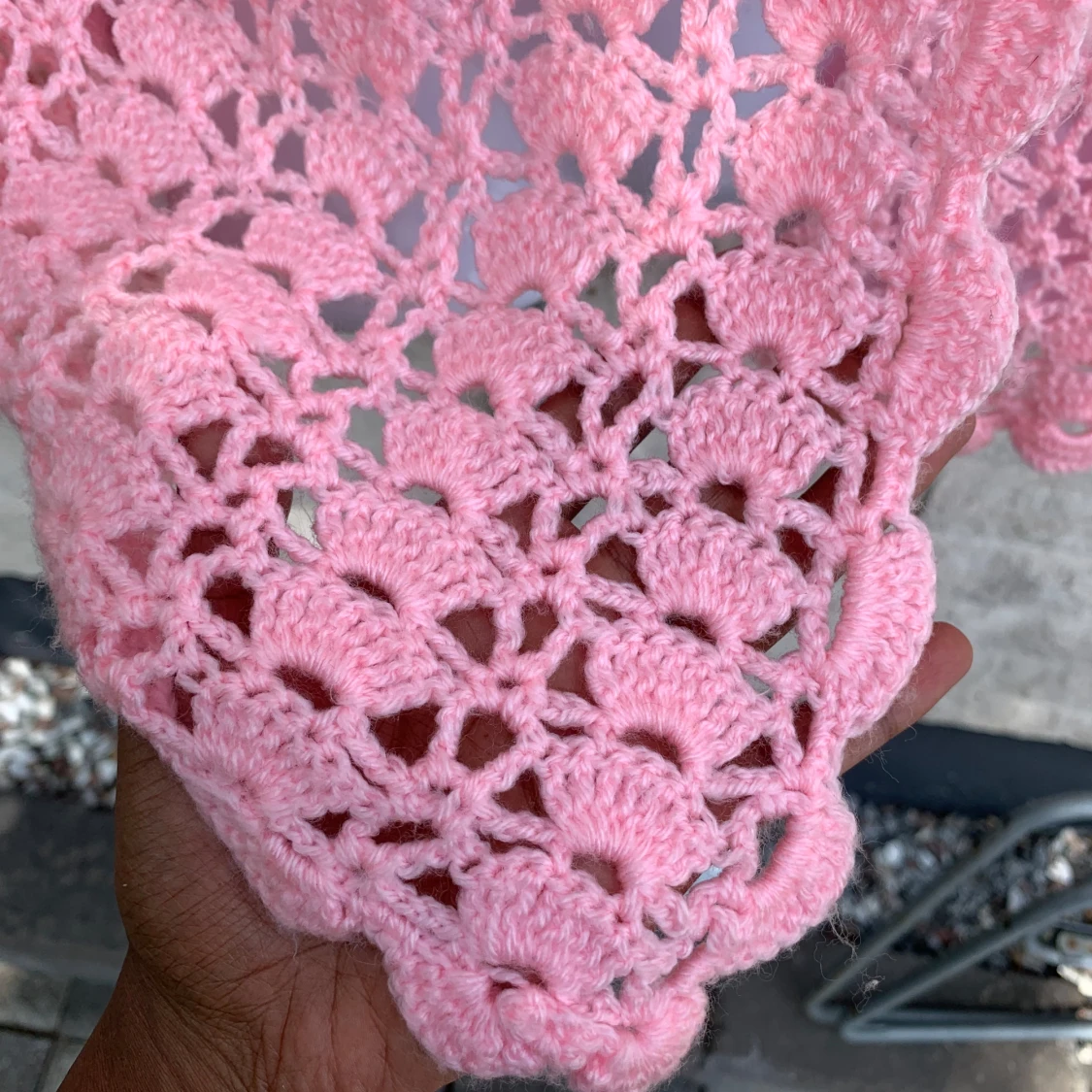 Rosa virkad kofta med knytband