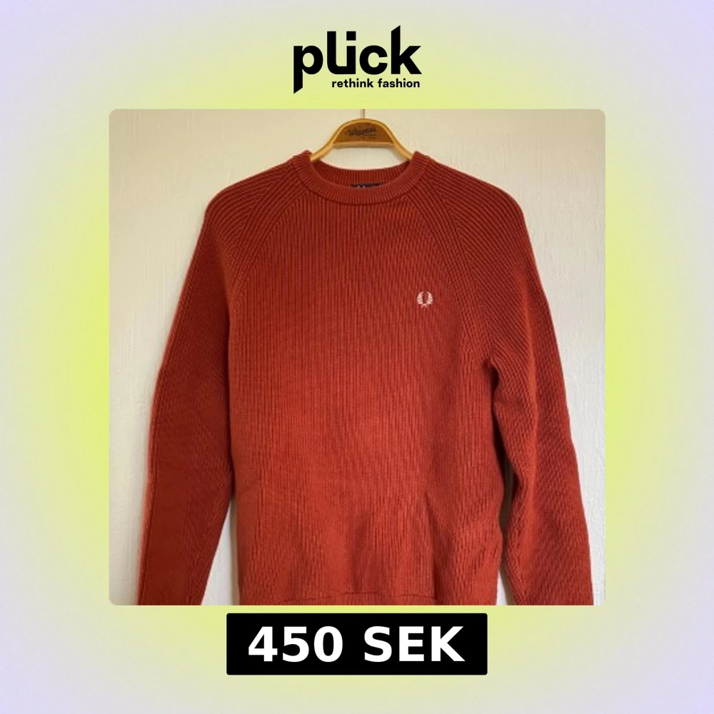 Säljer en snygg rostfärgad stickad tröja från Fred Perry med rund halsringning och diskret logga på bröstet. Tröjan har lång ärm och ribbade muddar vid ärmslut och nederkant. Perfekt för kyligare dagar!