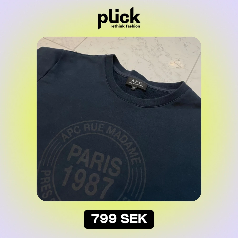 Säljer en stilren mörkblå tröja från A.P.C. med tryck 'Paris 1987' på framsidan. Tröjan har en normal passform och är perfekt för både vardag och avslappnade tillfällen. Den är i mycket bra skick och gjord av mjukt bomullsmaterial.