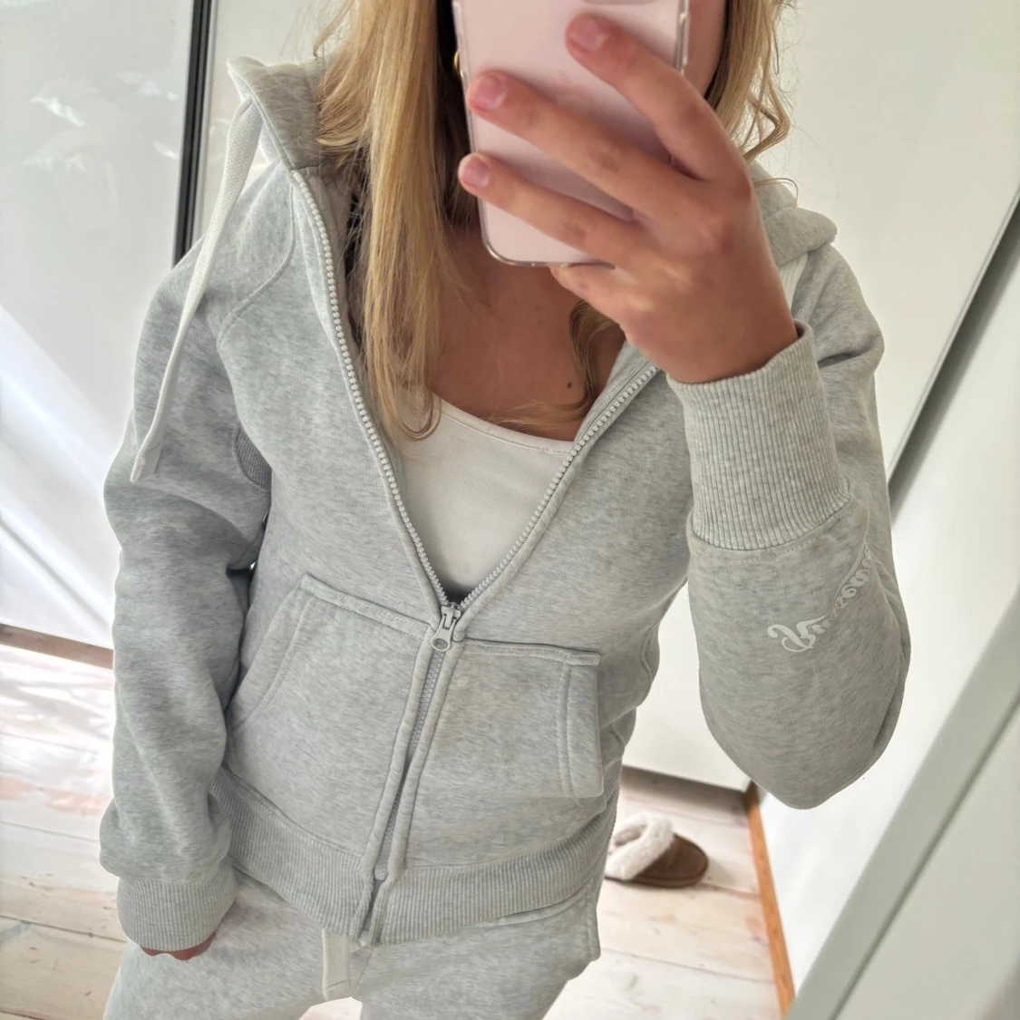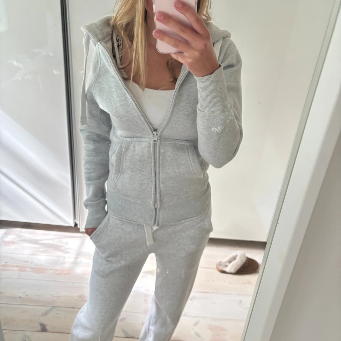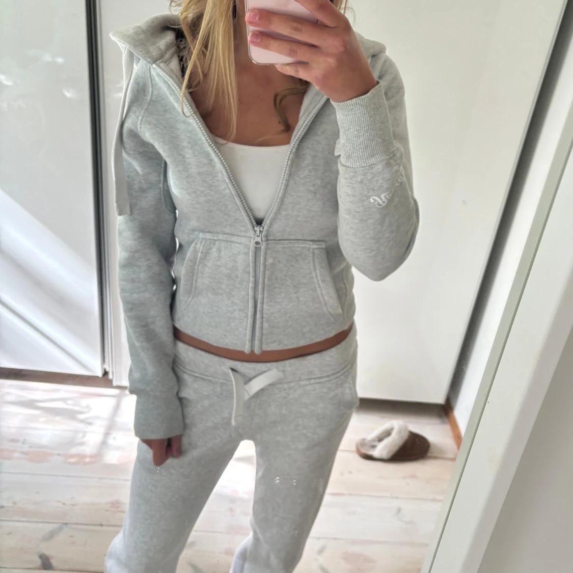 Säljer mitt ljusgråa sett ifrån russemerch! Tröjan är i storlek xxs och mjukisbyxorna i xs!