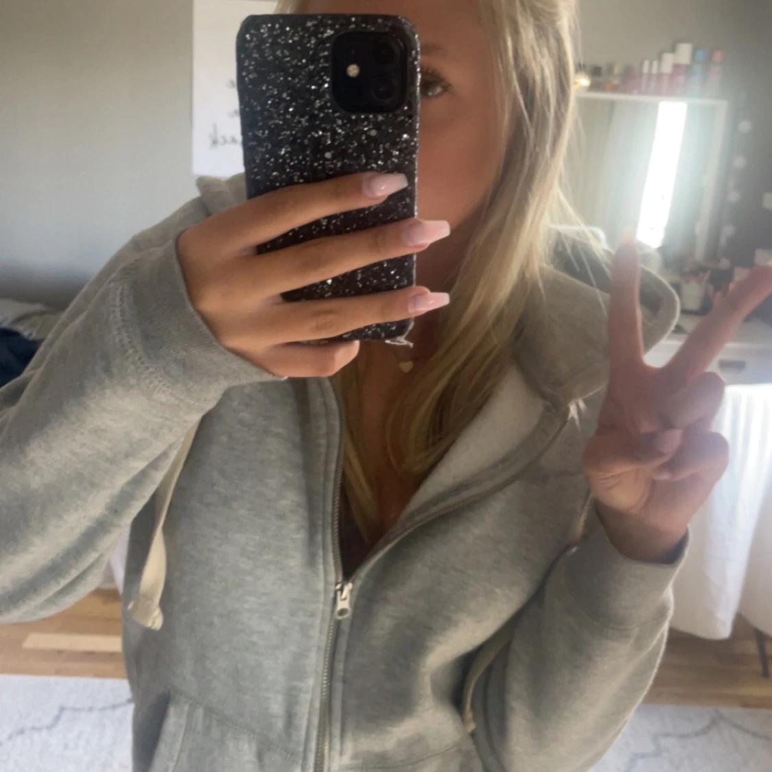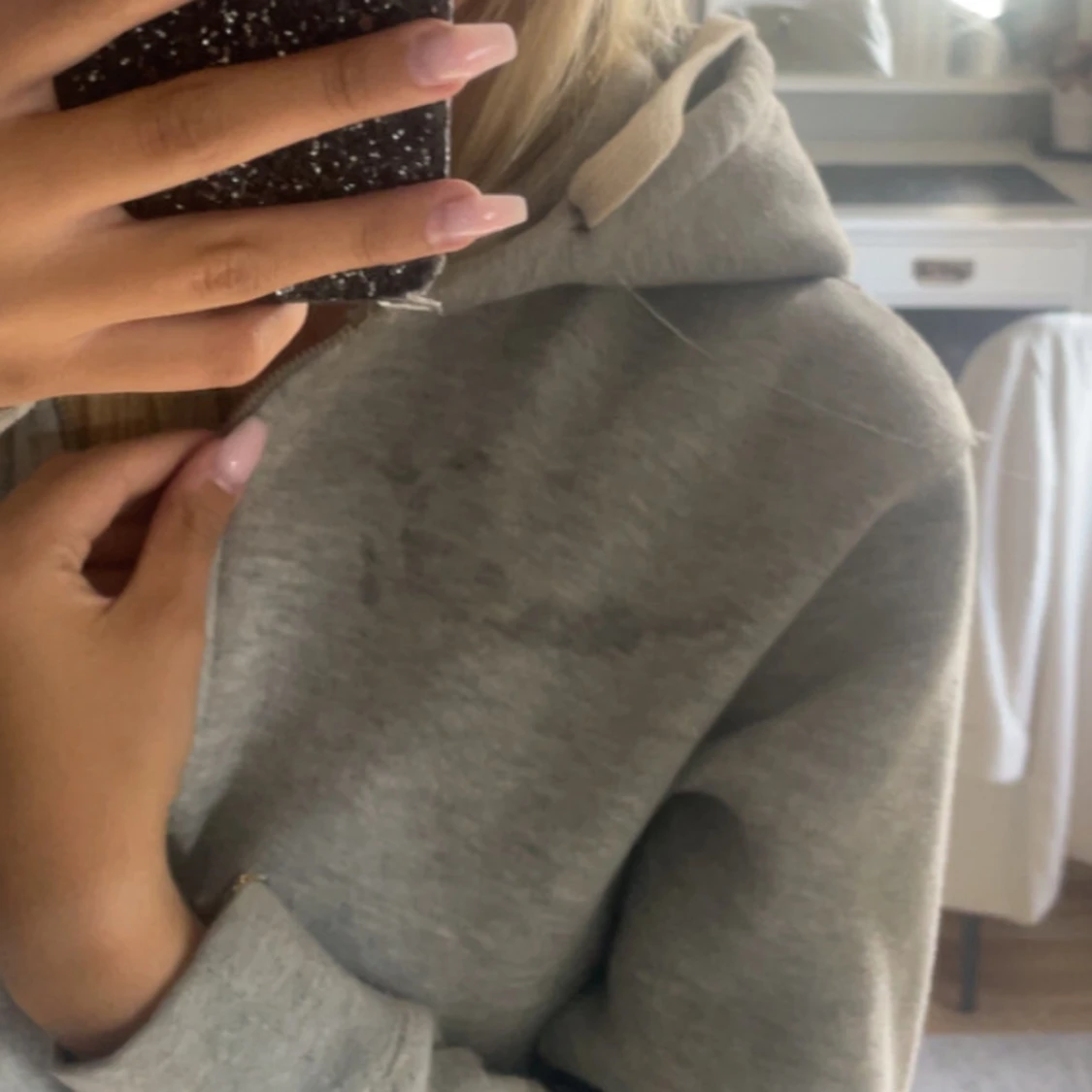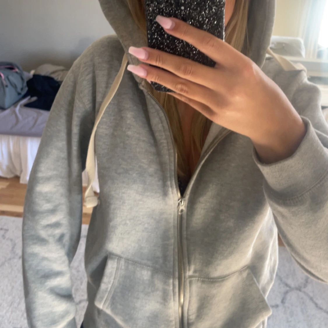 Mysig grå hoodie med dragkedja framtill och stora fickor. Tröjan har huva med vita snören och är långärmad. Perfekt för chill dagar eller när du vill vara extra bekväm. Enkel och stilren design som passar till det mesta. Lite smutsig som inye går bort med bara tvättmaskin