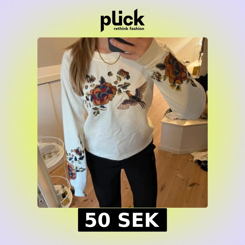 Snygg vit sweatshirt med färgglada broderade blommor och fågelmotiv på bröstet och ärmarna.