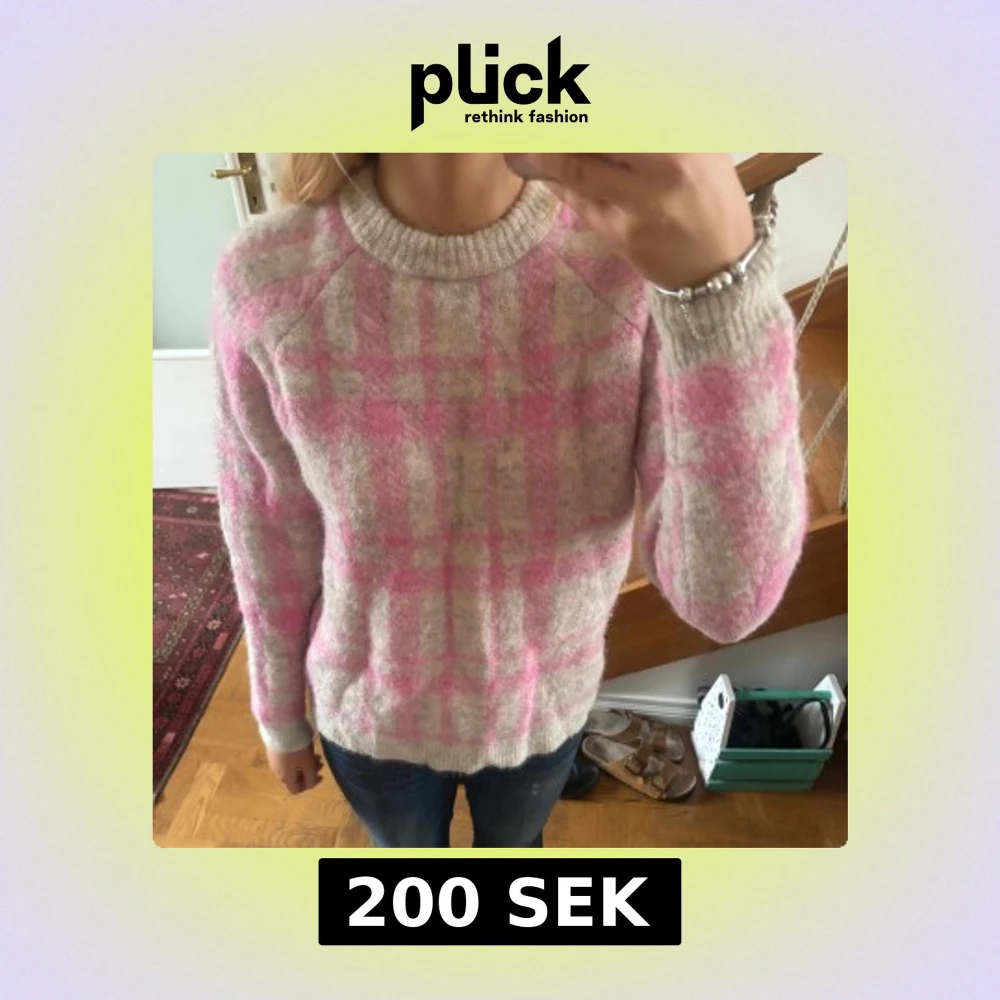 Superfin stickad tröja från Carin Wester i beige och rosa rutor. Tröjan har rund halsringning, lång ärm och en mysig, fluffig känsla. Perfekt för dig som gillar en söt och trendig look med lite retrovibbar.