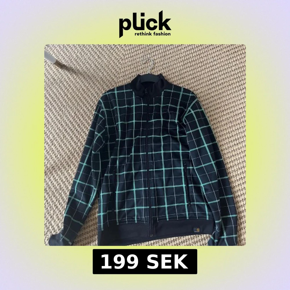 Svart jacka från Carhartt i storlek L men passar som M med rutigt mönster i vitt och grönt. Jackan har dragkedja framtill, ståkrage och två fickor med dragkedja. Tillverkad i 100% polyester och har en sportig, clean vibe som passar perfekt till streetwear.