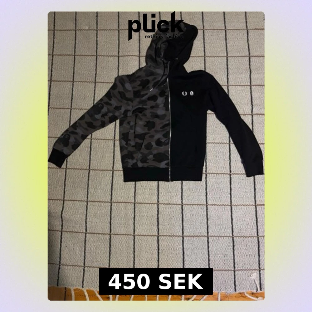 Unik hoodie med halvsvart och halvcamouflage design från Fred Perry x A Bathing Ape. Dragkedja framtill, två fickor och huva. Materialet är mjukt och bekvämt, perfekt för att sticka ut. Logotyp på bröstet och text på ryggen.